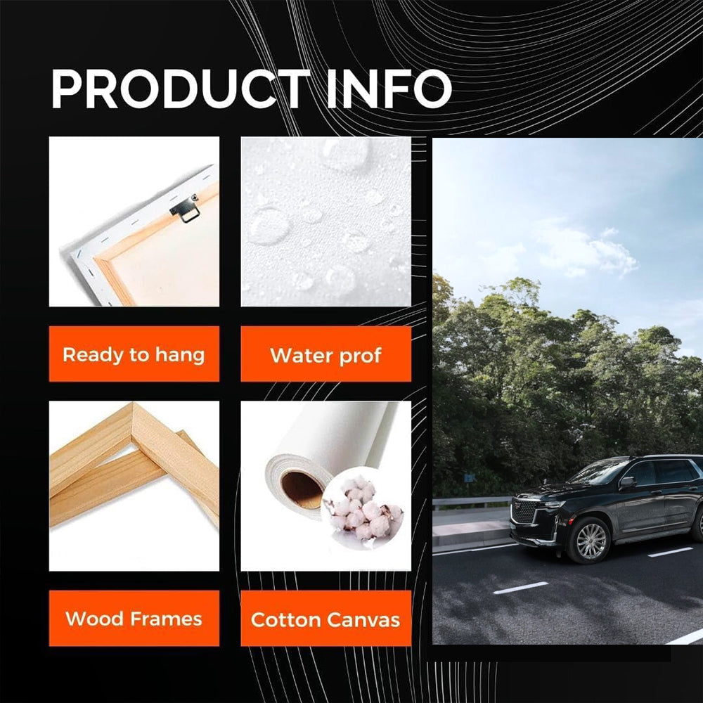 This painting is a real poster for those who breathe gasoline. Cadillac in black on the road is pure adrenaline on the wall. Wall art that will make your heart beat faster. This poster is the quintessence of speed and daring. You want this at home. See more from the collection: Cadillac Art
