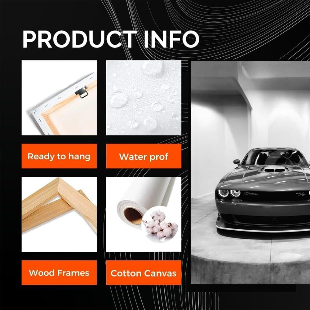 This painting is a wall art for those who breathe exhaust fumes and live for speed. A poster with a gray Dodge Challenger is not just a decoration, but a real adrenaline rush in your garage. This is for those who understand what power and style are on the road. See more from the collection: Dodge Art