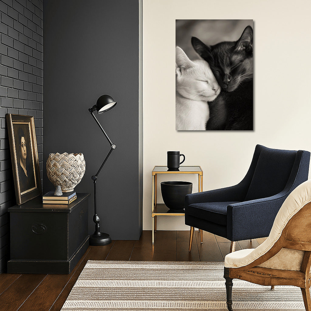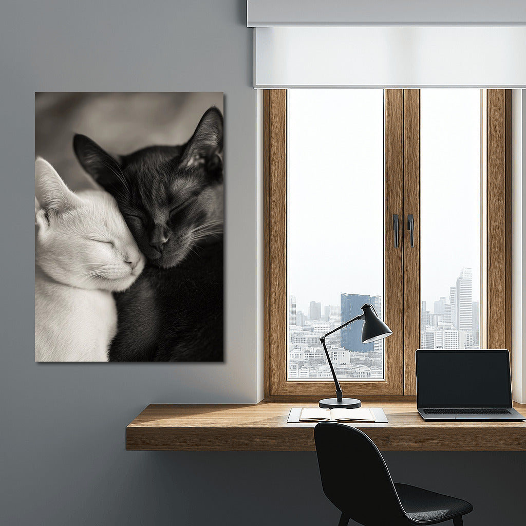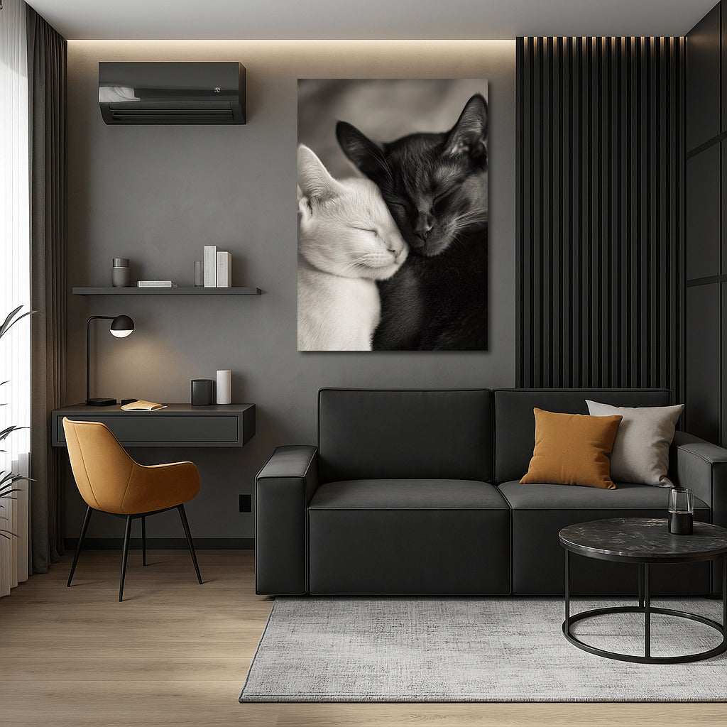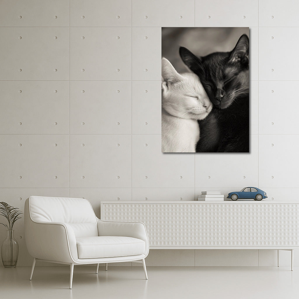 Coziness and tenderness on canvas: a black and white poster with a pair of sweetly sleeping cats. The perfect wall art for your home. See more from the collection: Animals Art