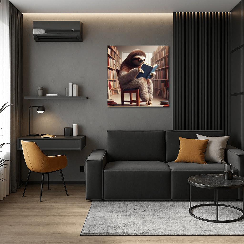 A sloth in a library, comfortably settled on a small chair, immersing himself in the world of books. The perfect poster for book lovers! See more from the collection: Animals Art