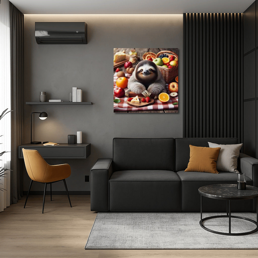 Sloth on a Picnic: A poster with a cozy atmosphere, where the furry hero enjoys fruits and cheese on a plaid blanket. See more from the collection: Animals Art