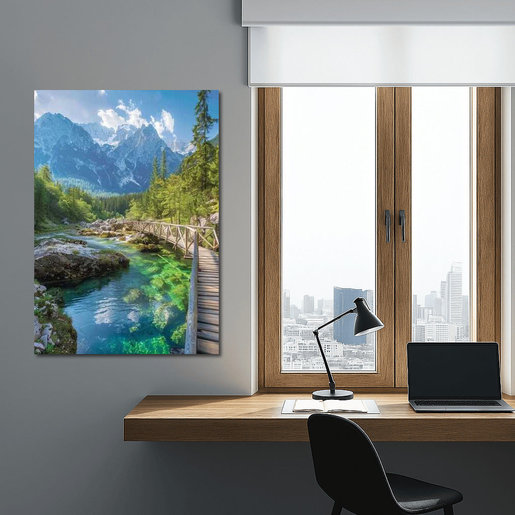 The vastness of Slovenia comes alive in this poster featuring a clear river and majestic mountains. Wall art for inspiration. See more from the collection: Country Art