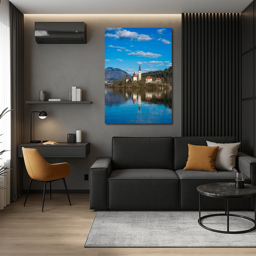 Idyllic Slovenia: a paintingsque island with a church, the calm of the water and the grandeur of the mountains. An inspiring poster for your space. See more from the collection: Country Art