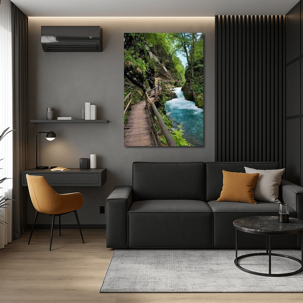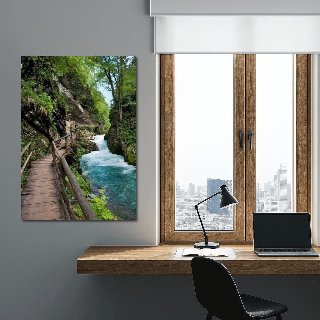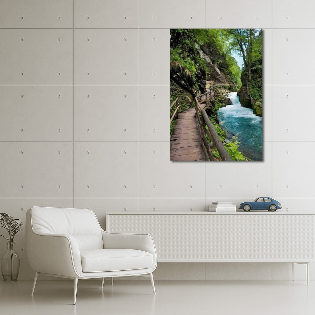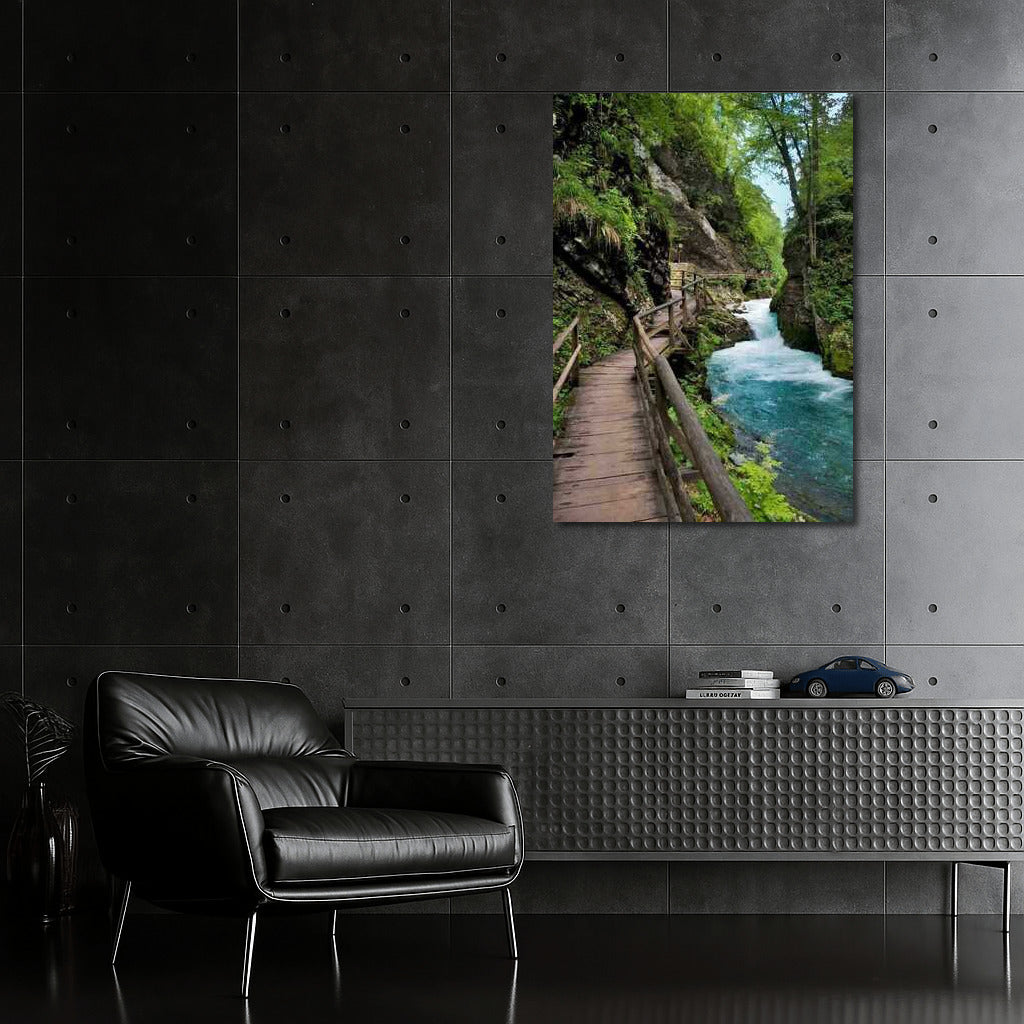 Slovenia comes alive on a poster: a winding path through greenery and a bubbling stream. Wall art filled with nature. See more from the collection: Country Art