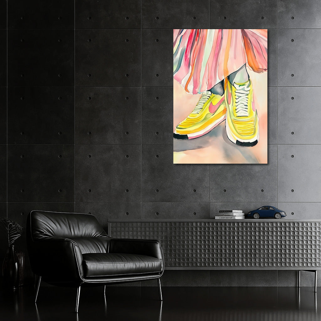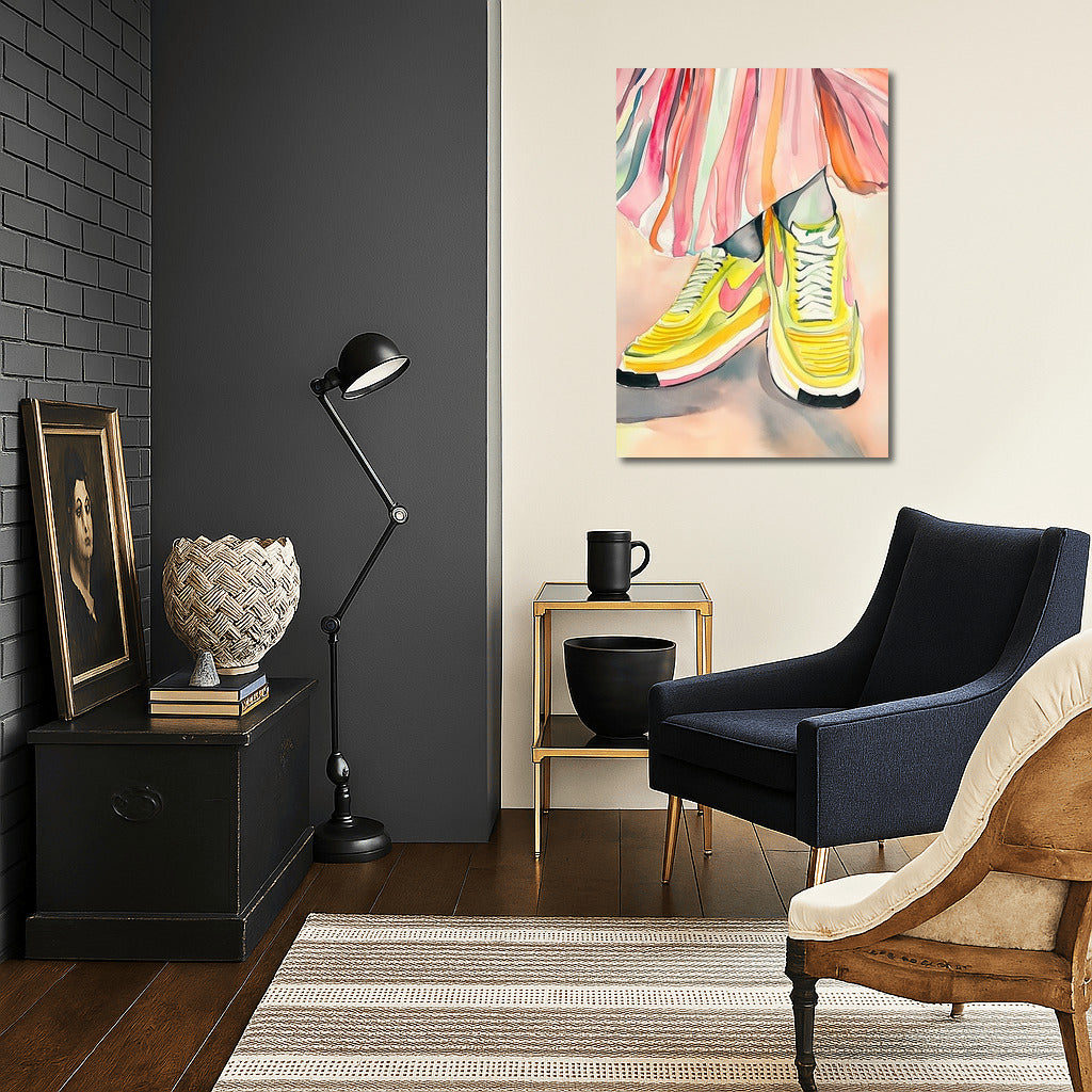 A bright splash of color and style in a painting: a poster with watercolor of sneakers and flowing fabric. Wall art for fashion solutions. See more from the collection: Nike Art