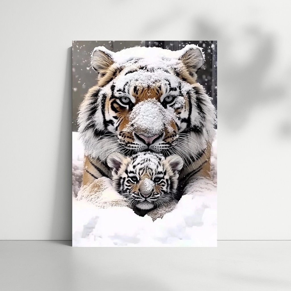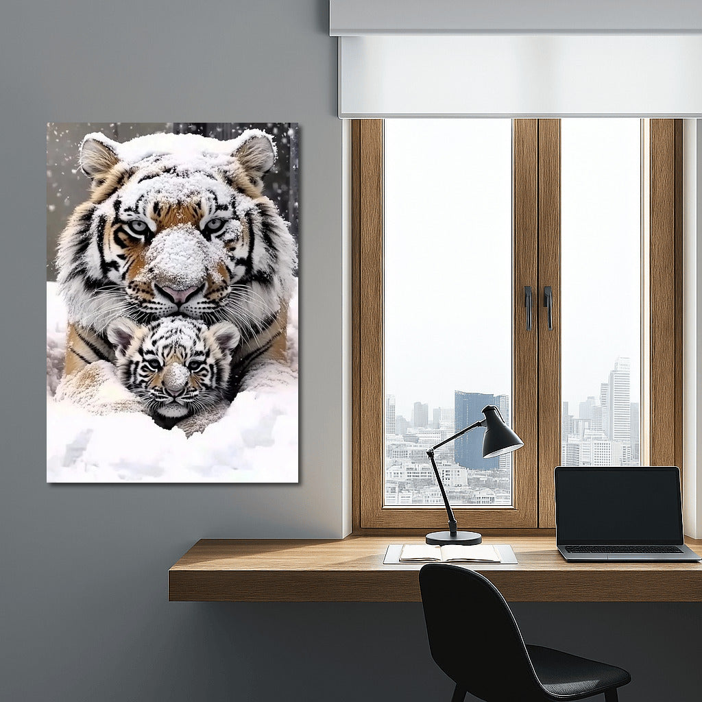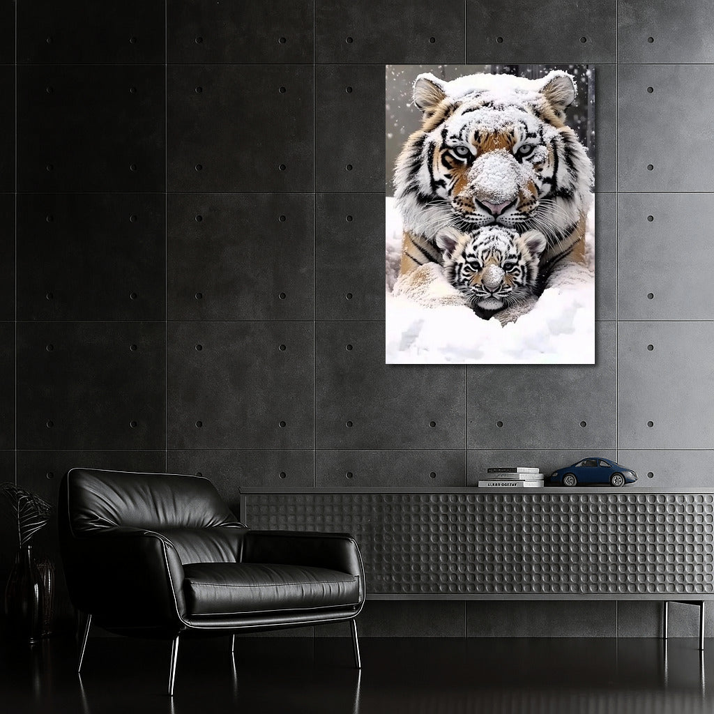 Dive into a winter fairy tale with a poster: a tiger and a tiger cub in a snowy forest. Natural harmony and power on your wall. See more from the collection: Animals Art