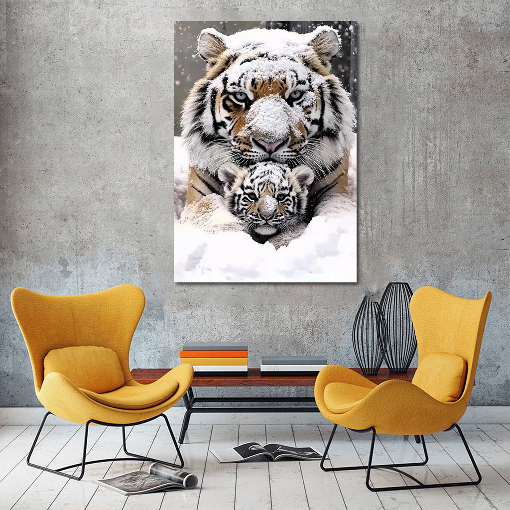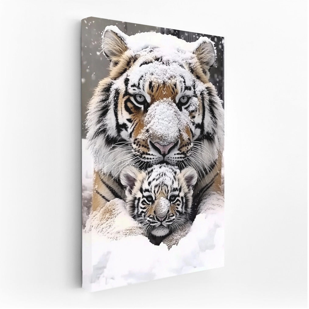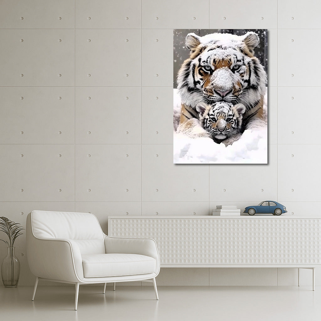Dive into a winter fairy tale with a poster: a tiger and a tiger cub in a snowy forest. Natural harmony and power on your wall. See more from the collection: Animals Art