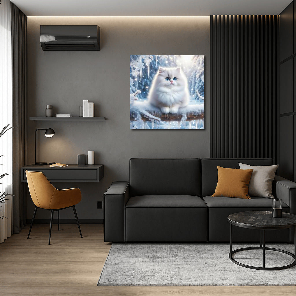 The charm of winter on the Snowy Wonderland 2 poster: a fluffy cat in a fairytale snowy forest. Art that warms the soul. See more from the collection: Animals Art