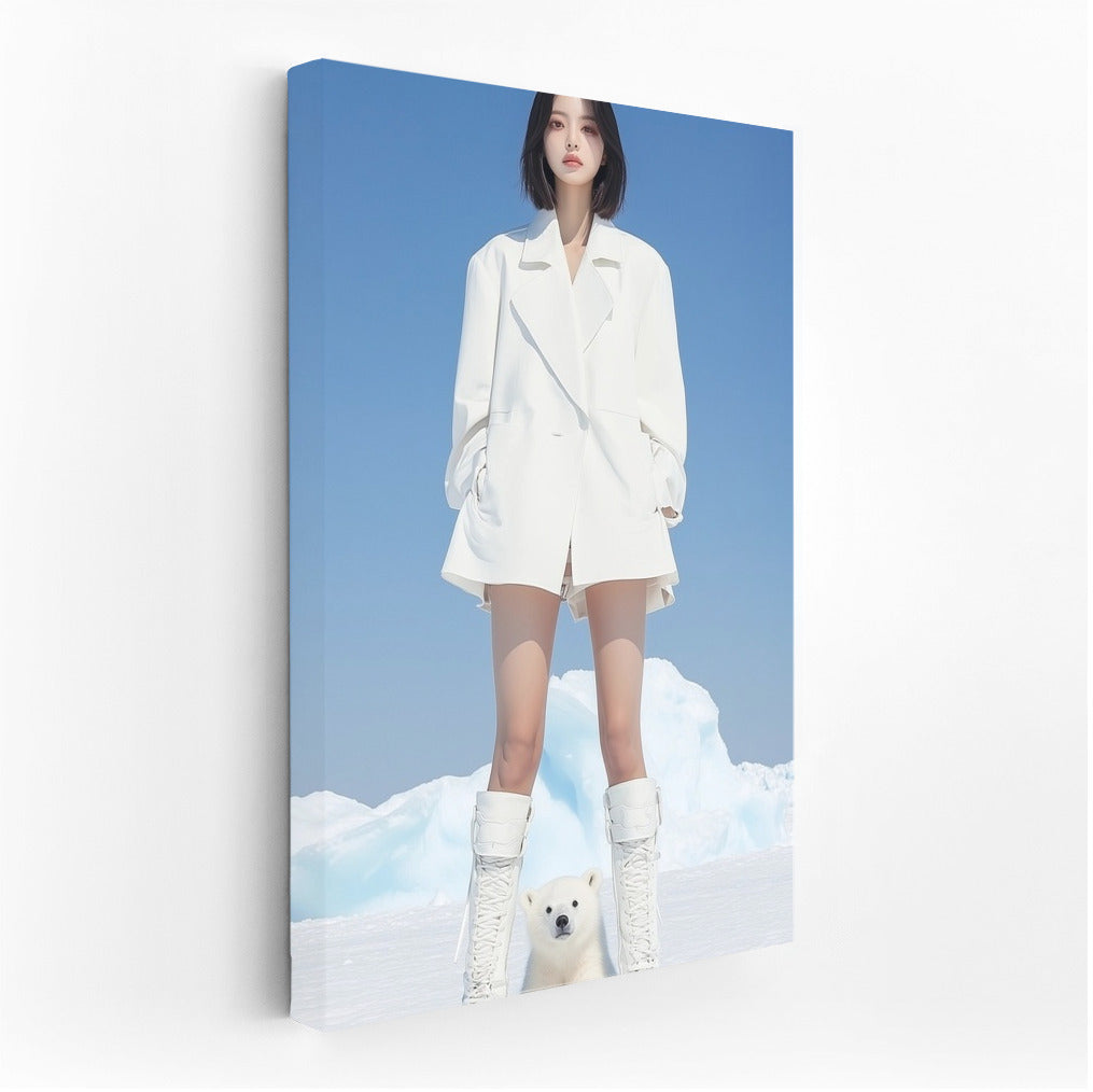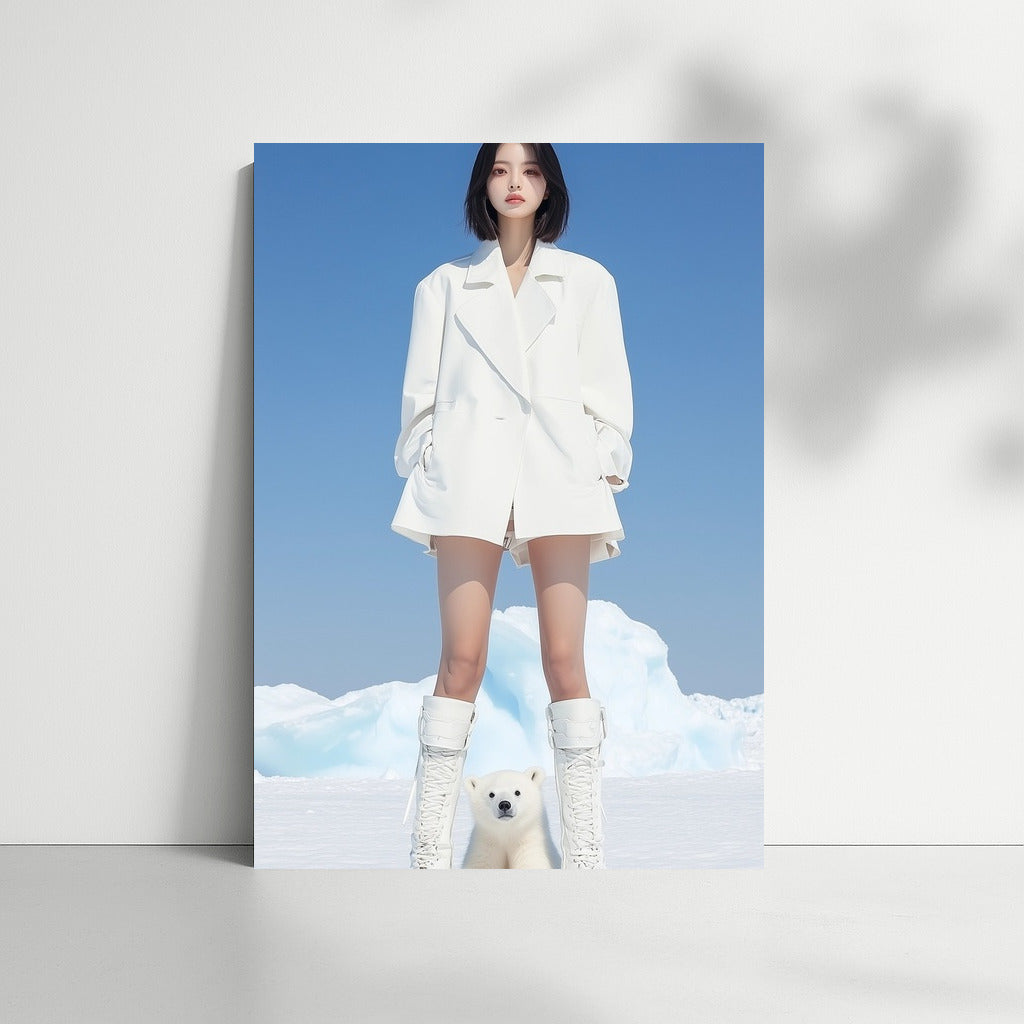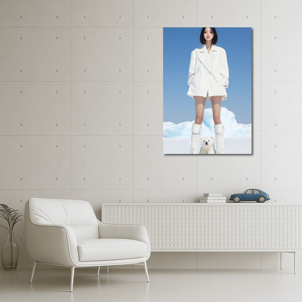 Elegant figure in white against a background of snow and ice with an adorable polar bear cub. Contemporary wall art. See more from the collection: Fashion Art