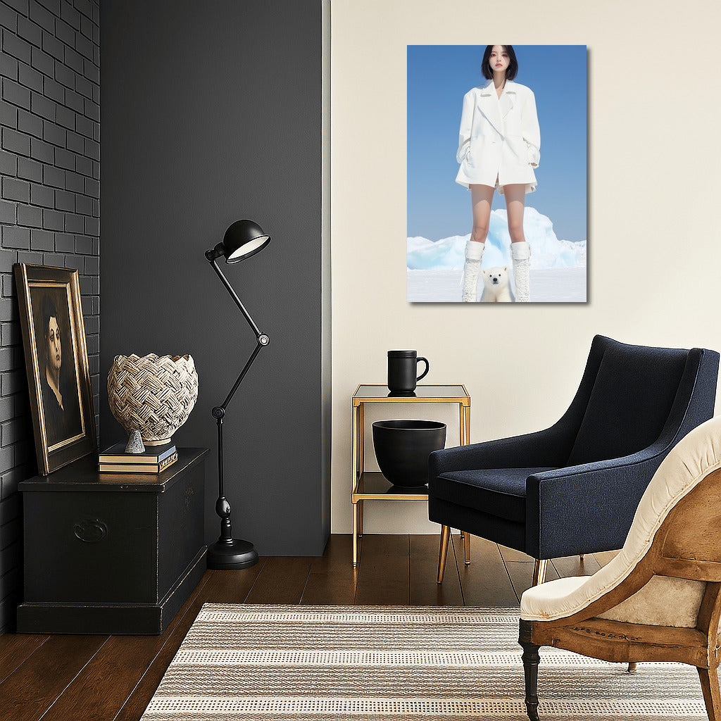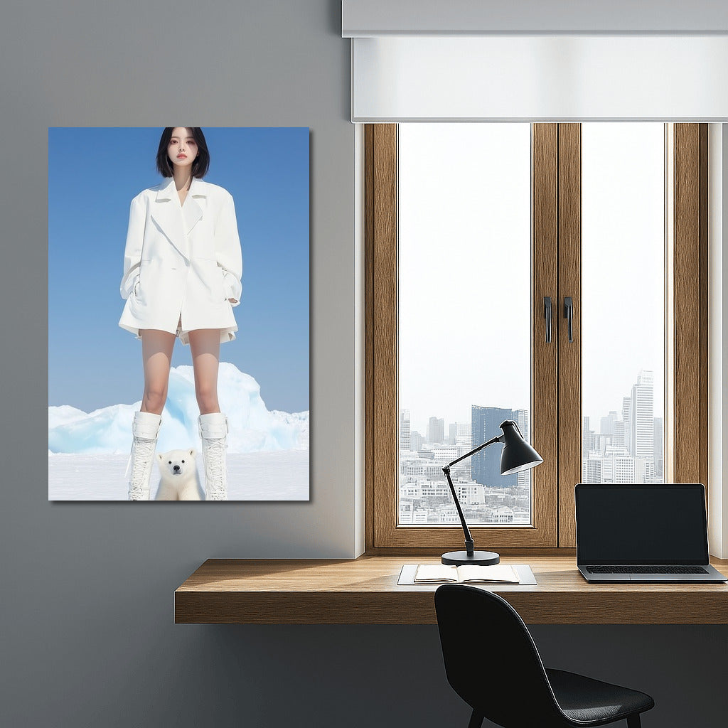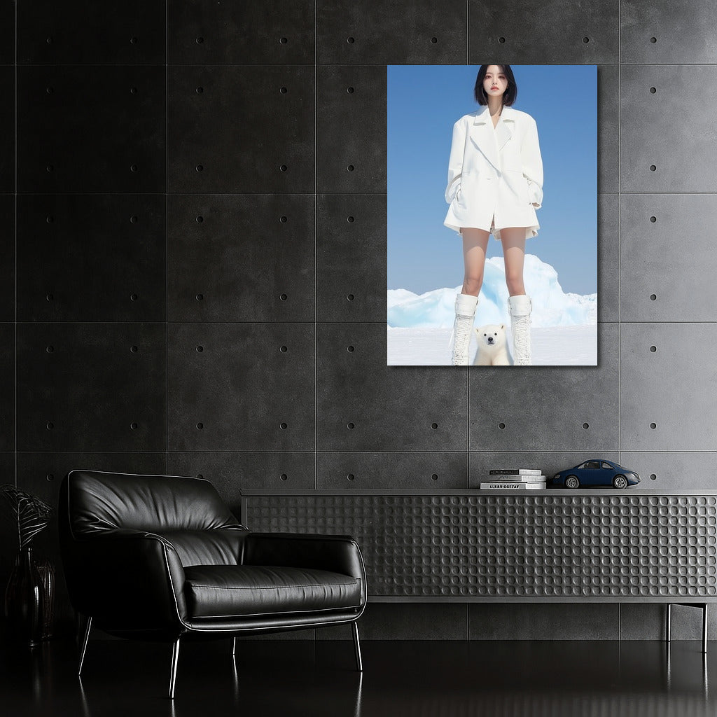 Elegant figure in white against a background of snow and ice with an adorable polar bear cub. Contemporary wall art. See more from the collection: Fashion Art