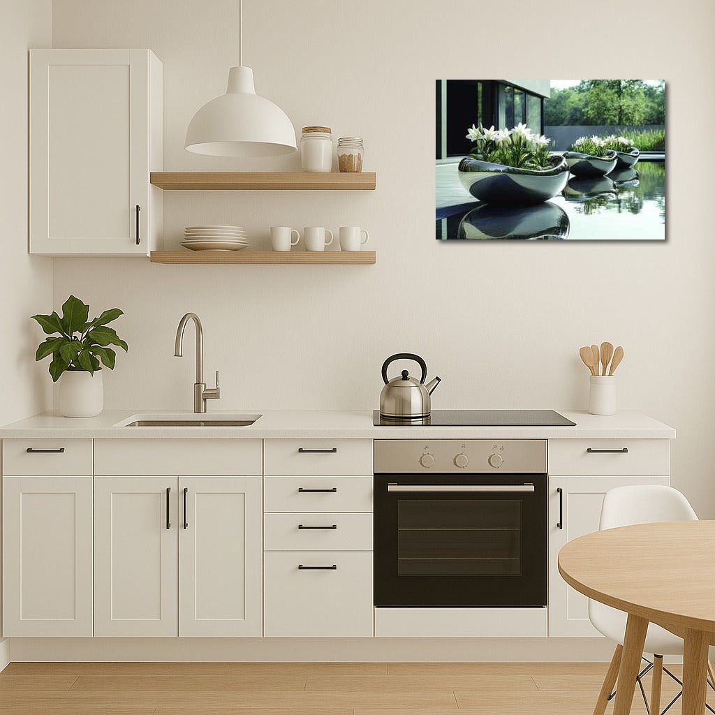 Elegant poster with snow-white lilies in stylish vases. Wall art where nature meets modernity. See more from the collection: Flowers Art