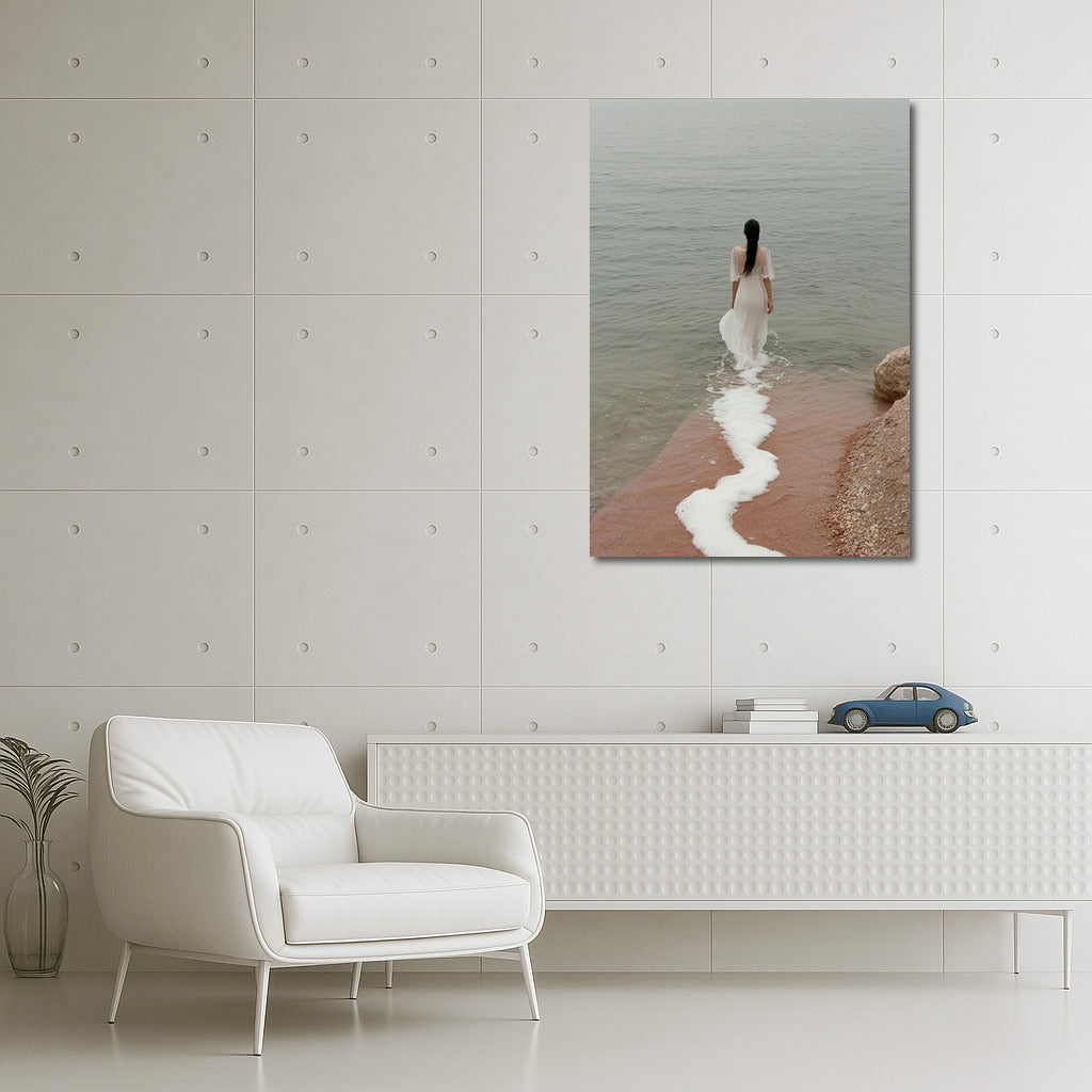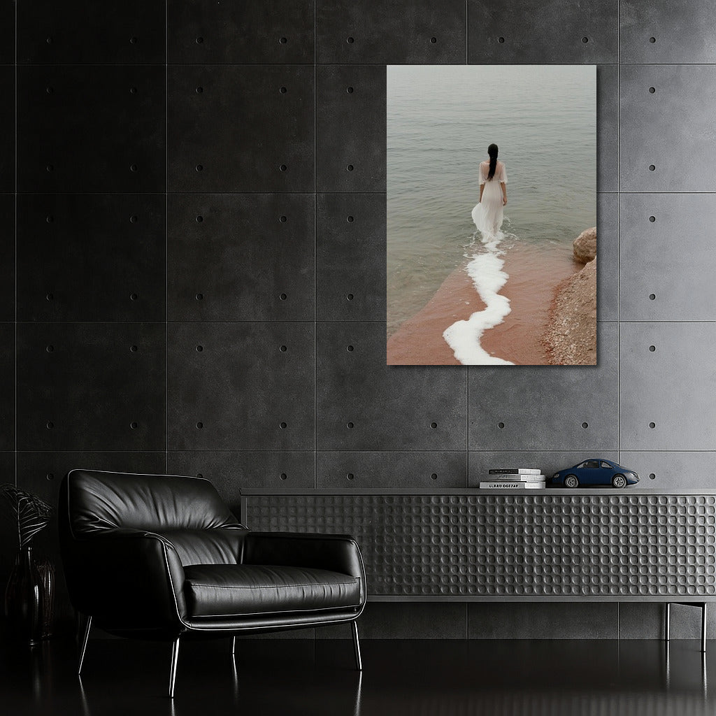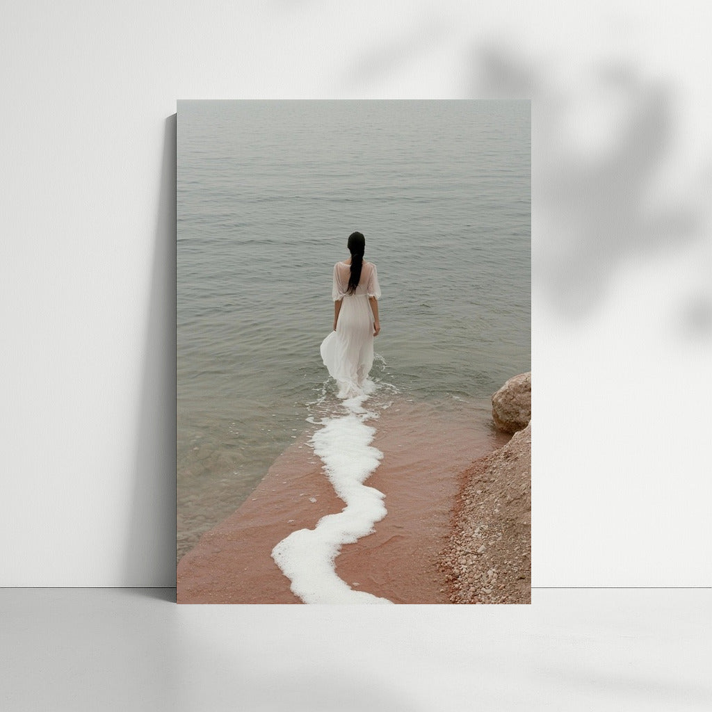 A captivating image of a figure in white stepping into an endless ocean. This poster will add mystery and tranquility to your space. See more from the collection: Mixed Wall Art