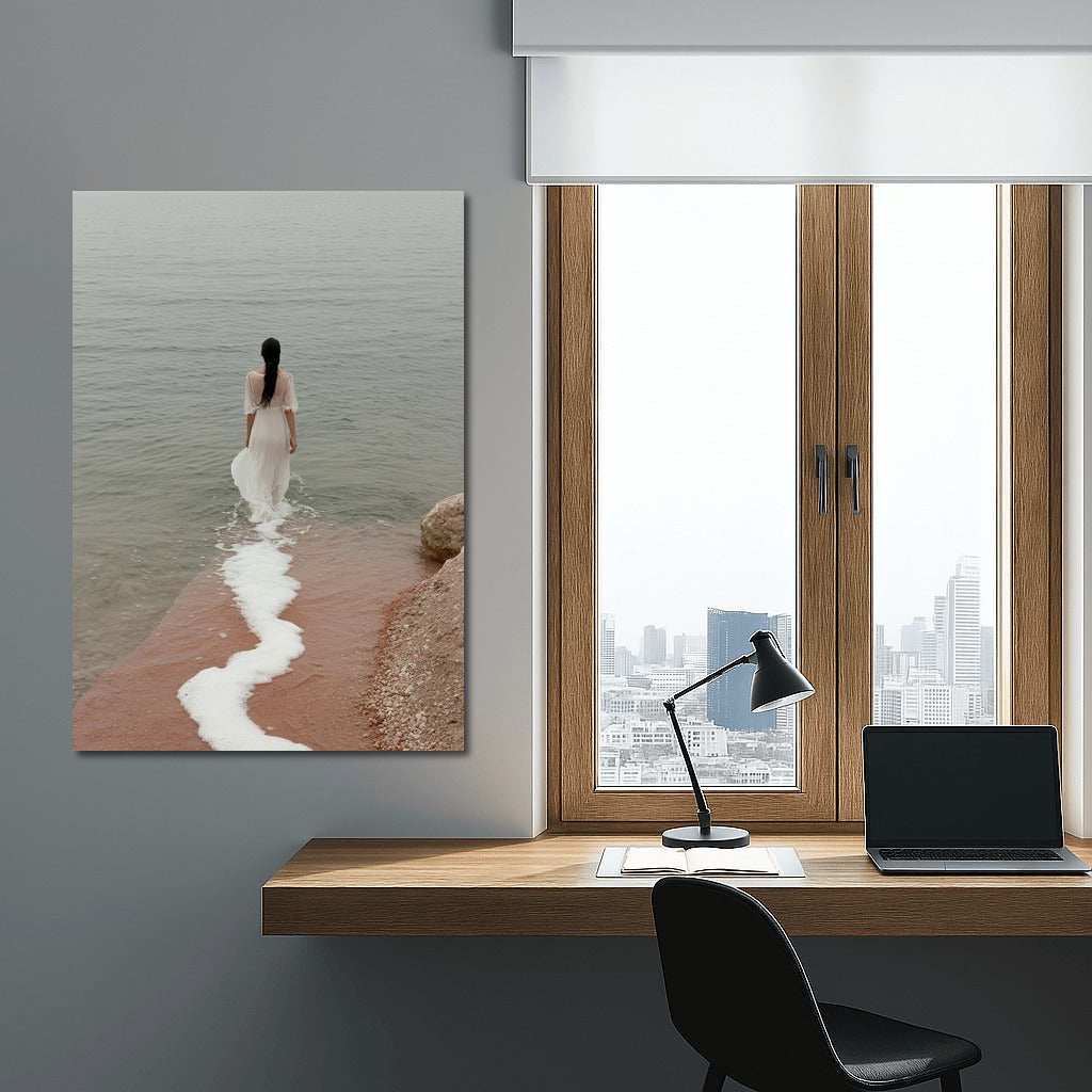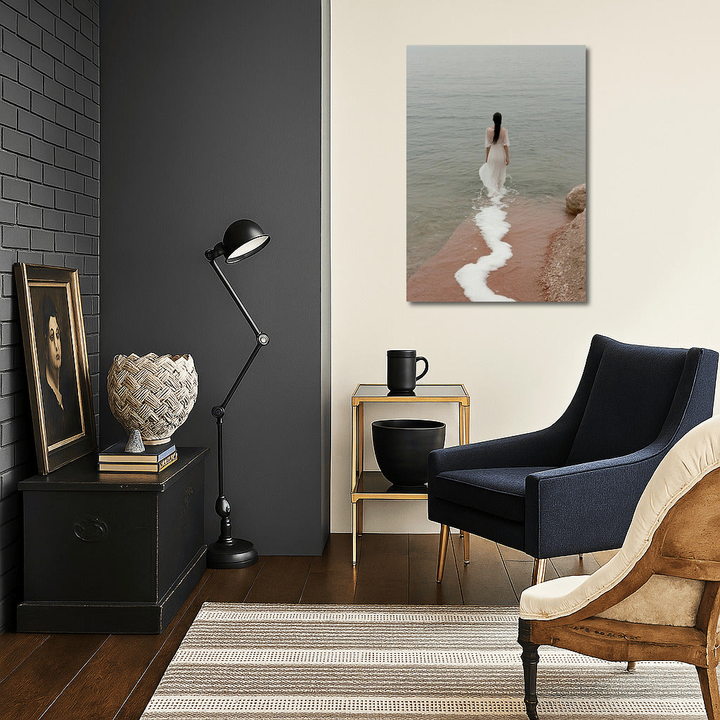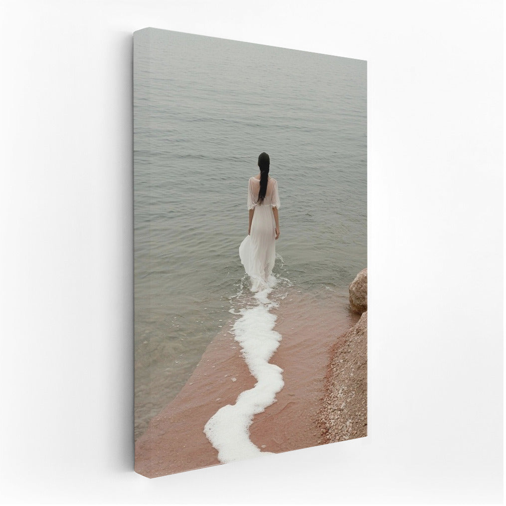 A captivating image of a figure in white stepping into an endless ocean. This poster will add mystery and tranquility to your space. See more from the collection: Mixed Wall Art