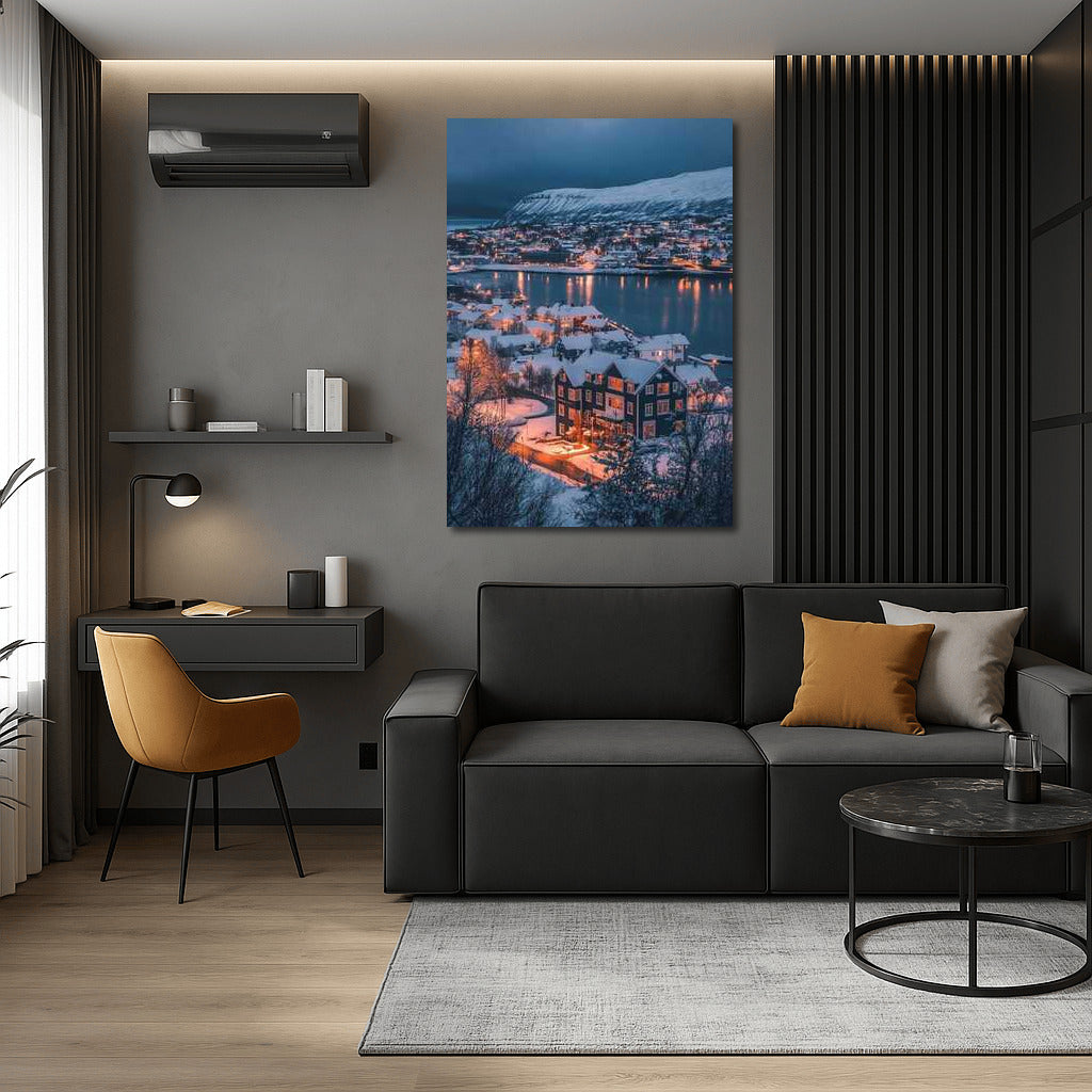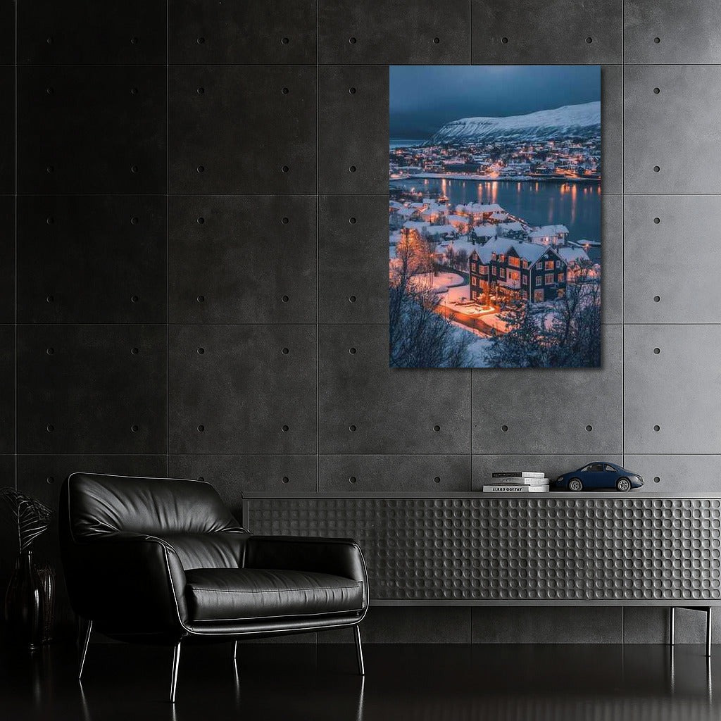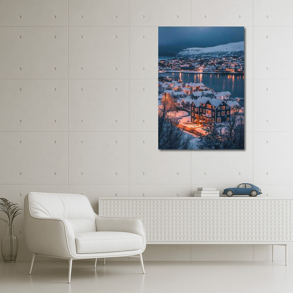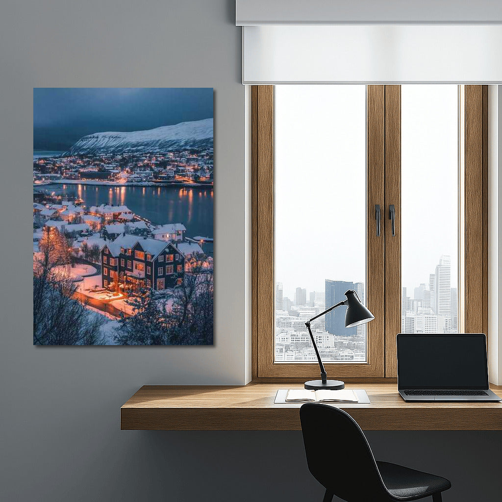 Icelandic city at night in snowy attire. Atmospheric poster will decorate your home with the warmth of a northern fairy tale. See more from the collection: Country Art