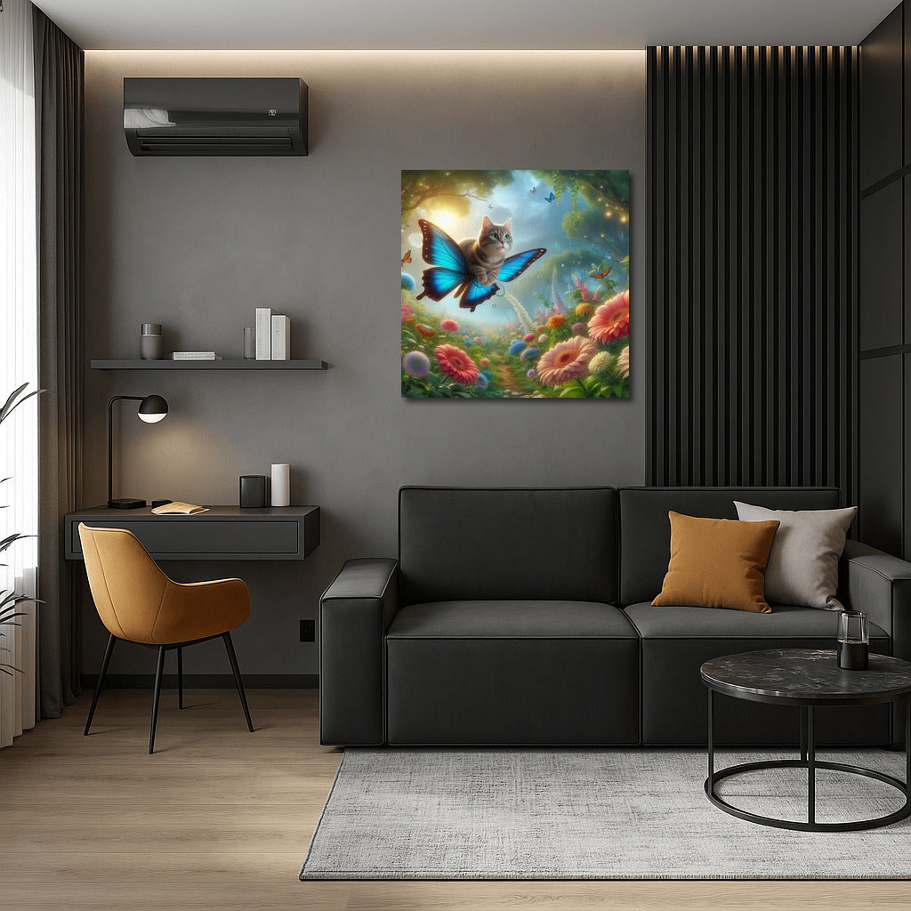 A cat soars on a giant butterfly among magical flowers. Magical wall art that will liven up any interior! See more from the collection: Animals Art