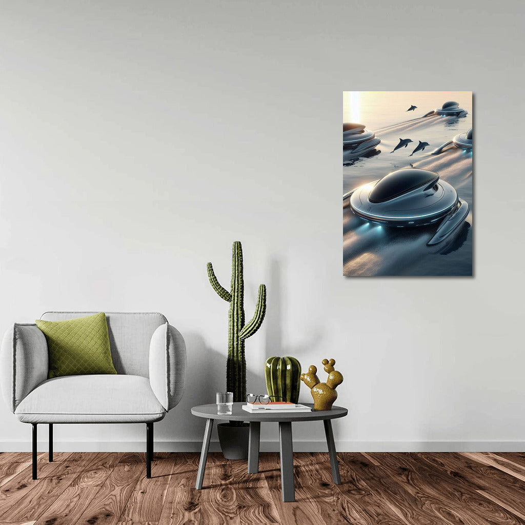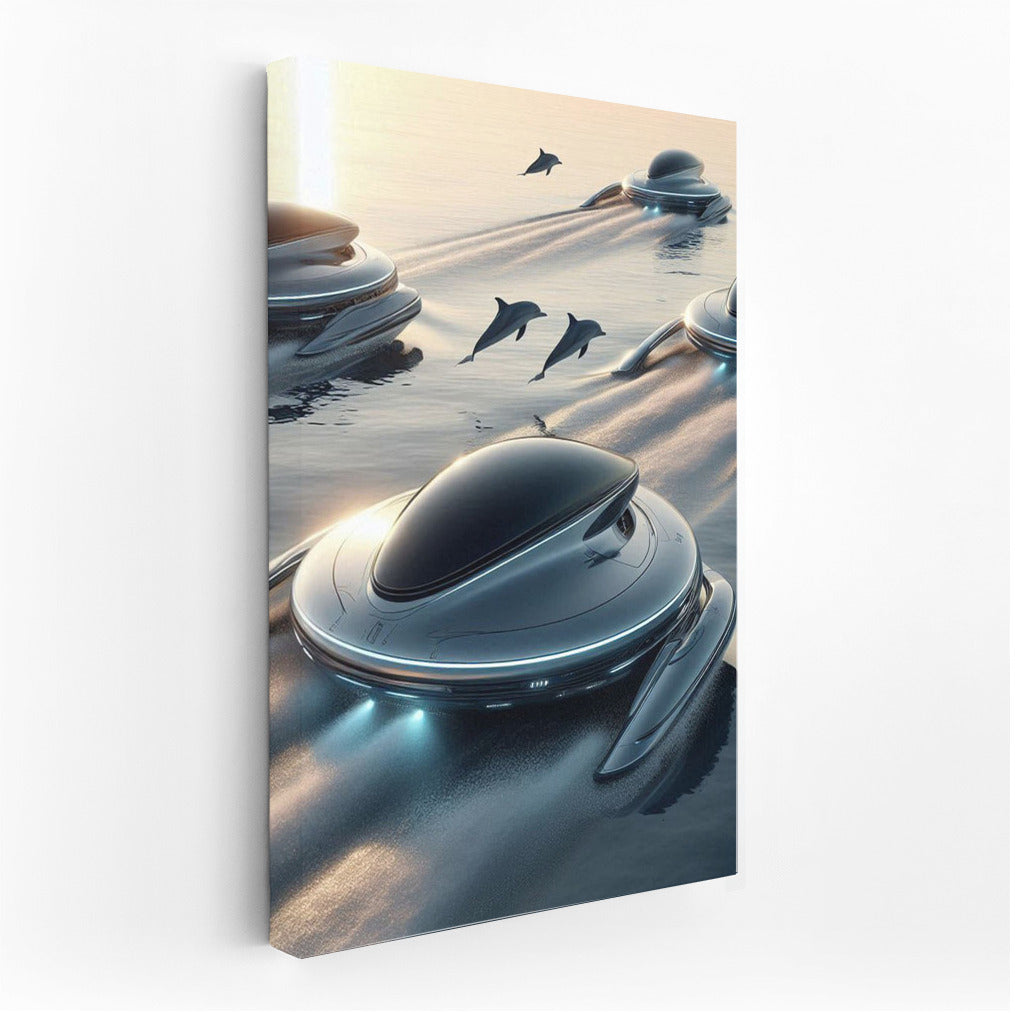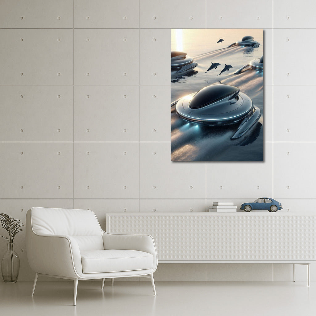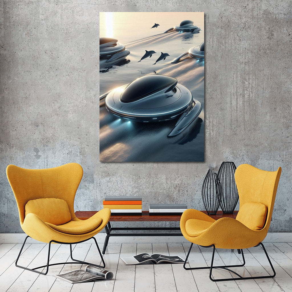 Soaring Hovercrafts and Playful Dolphins over the Ocean Wall Art
