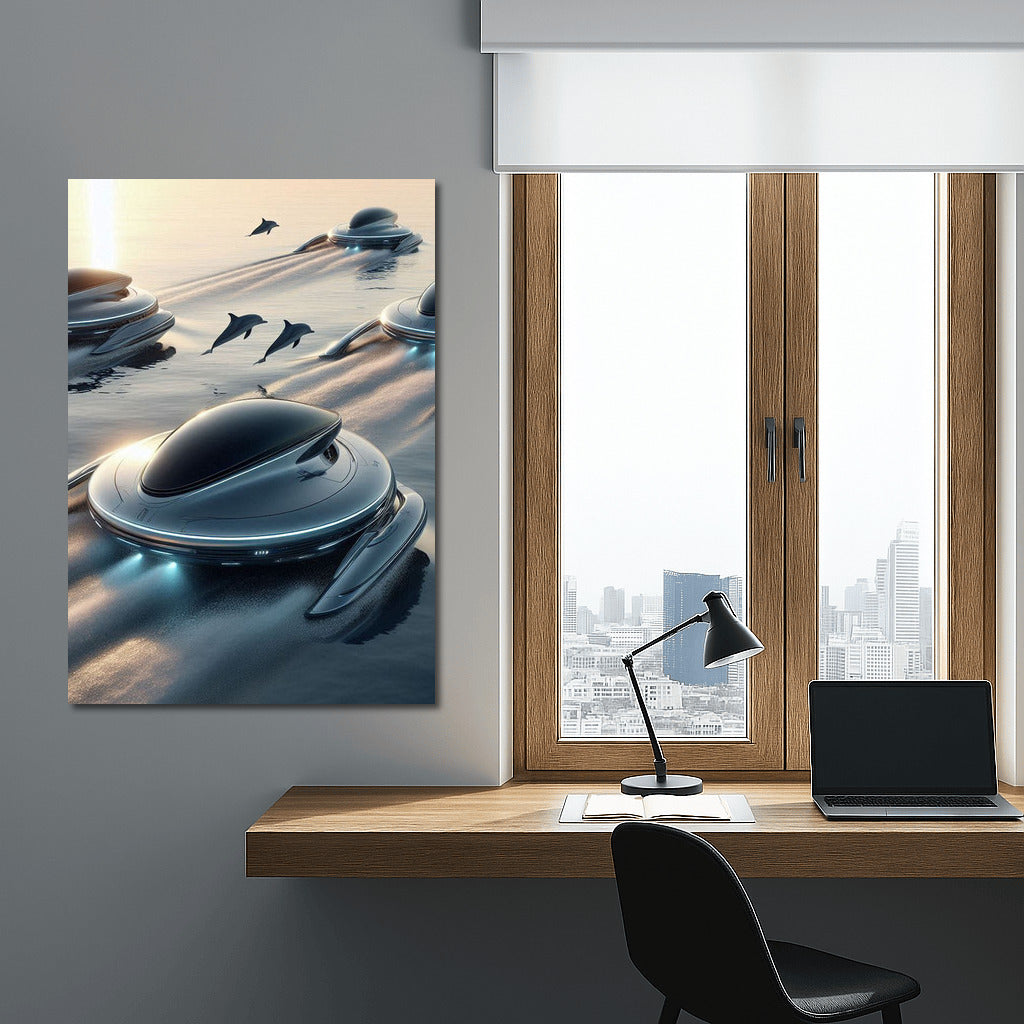 Futuristic poster with hovercrafts floating over the ocean and playful dolphins. Create a dream on your wall! See more from the collection: Futurism Art