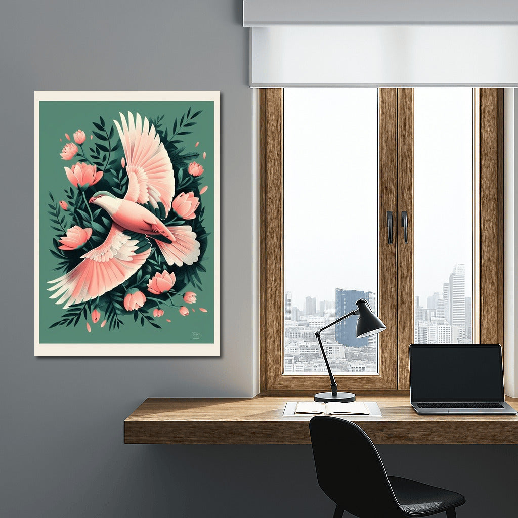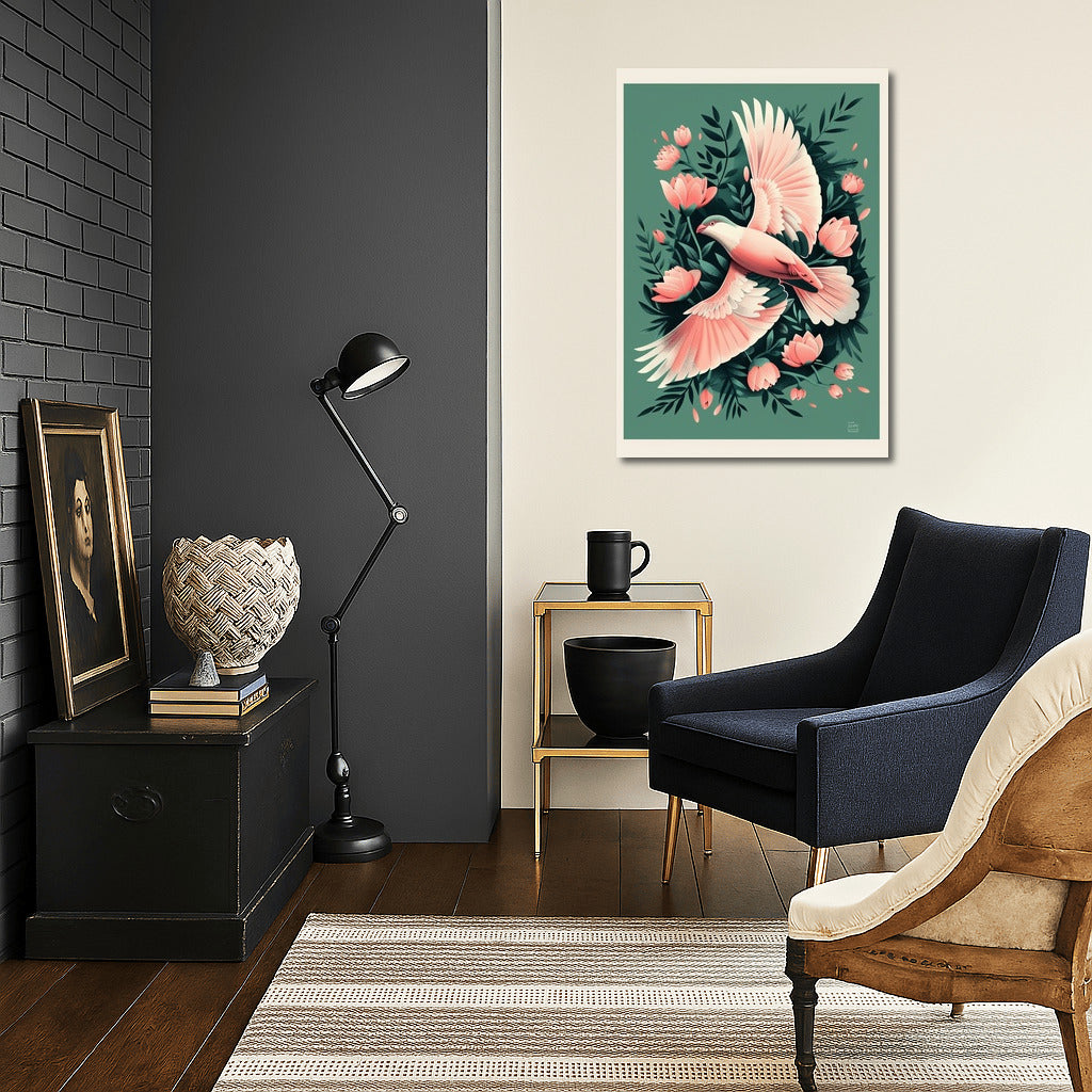 An airy flight of a pink bird among delicate flowers is a poster that will enliven the space and create an atmosphere of lightness. See more from the collection: Mixed Wall Art