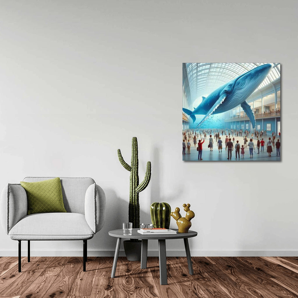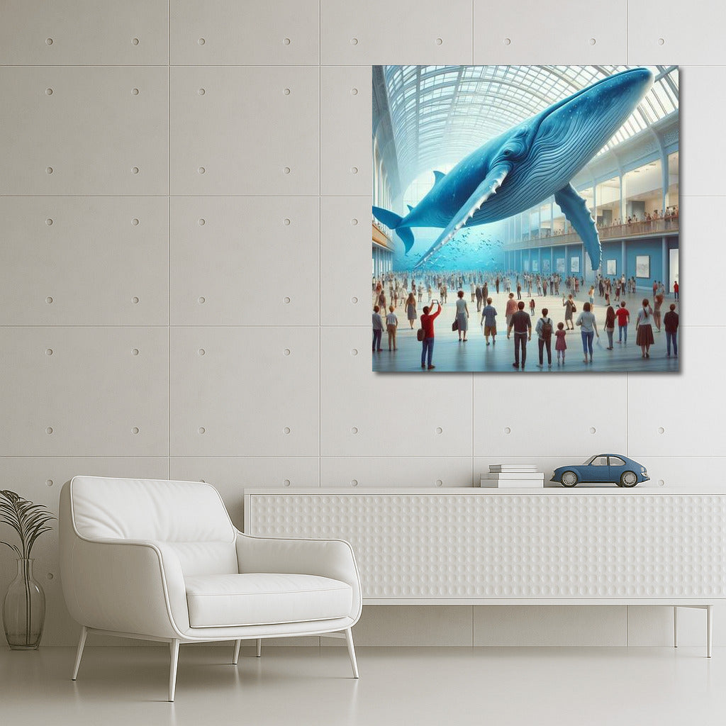 A huge whale soars through the museum, astonishing visitors. Immerse yourself in fantasy with this captivating wall art! See more from the collection: Animals Art