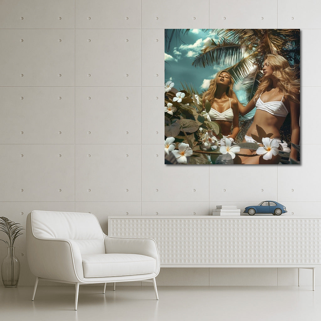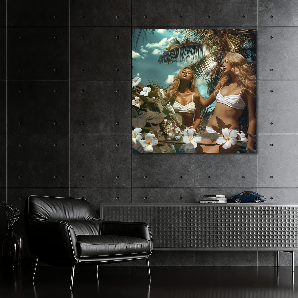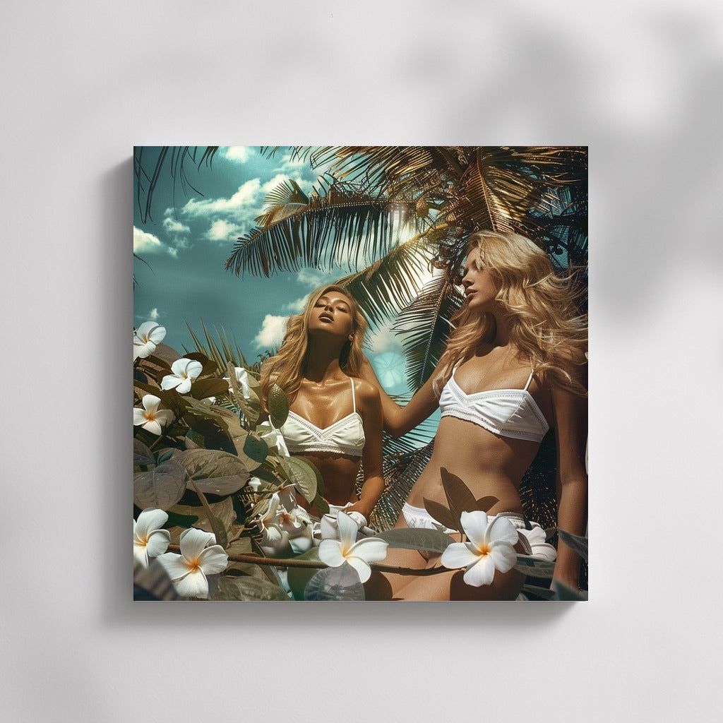 Tropical dream on a poster: sun rays, coconut palms and spring in the soul. Wall art that gives warmth all year round. See more from the collection: Wall Art with Women