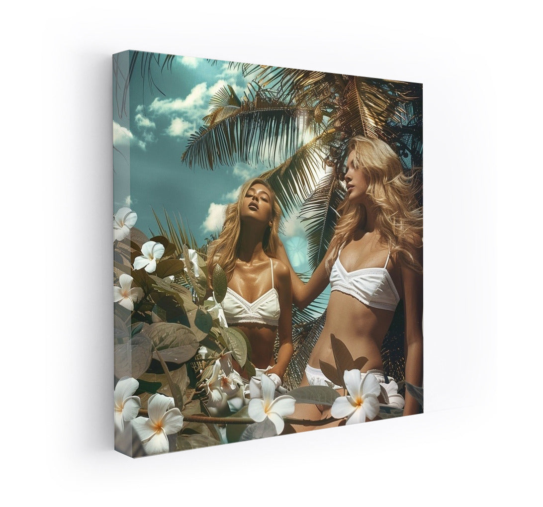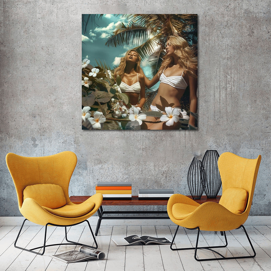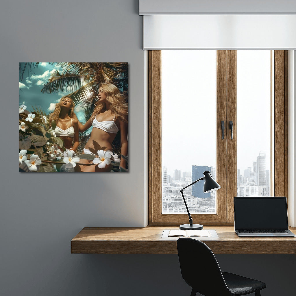 Tropical dream on a poster: sun rays, coconut palms and spring in the soul. Wall art that gives warmth all year round. See more from the collection: Wall Art with Women