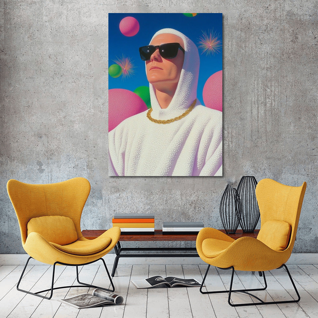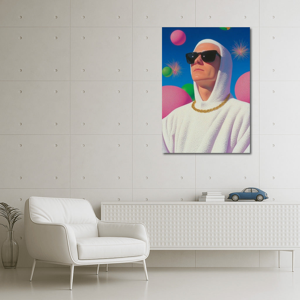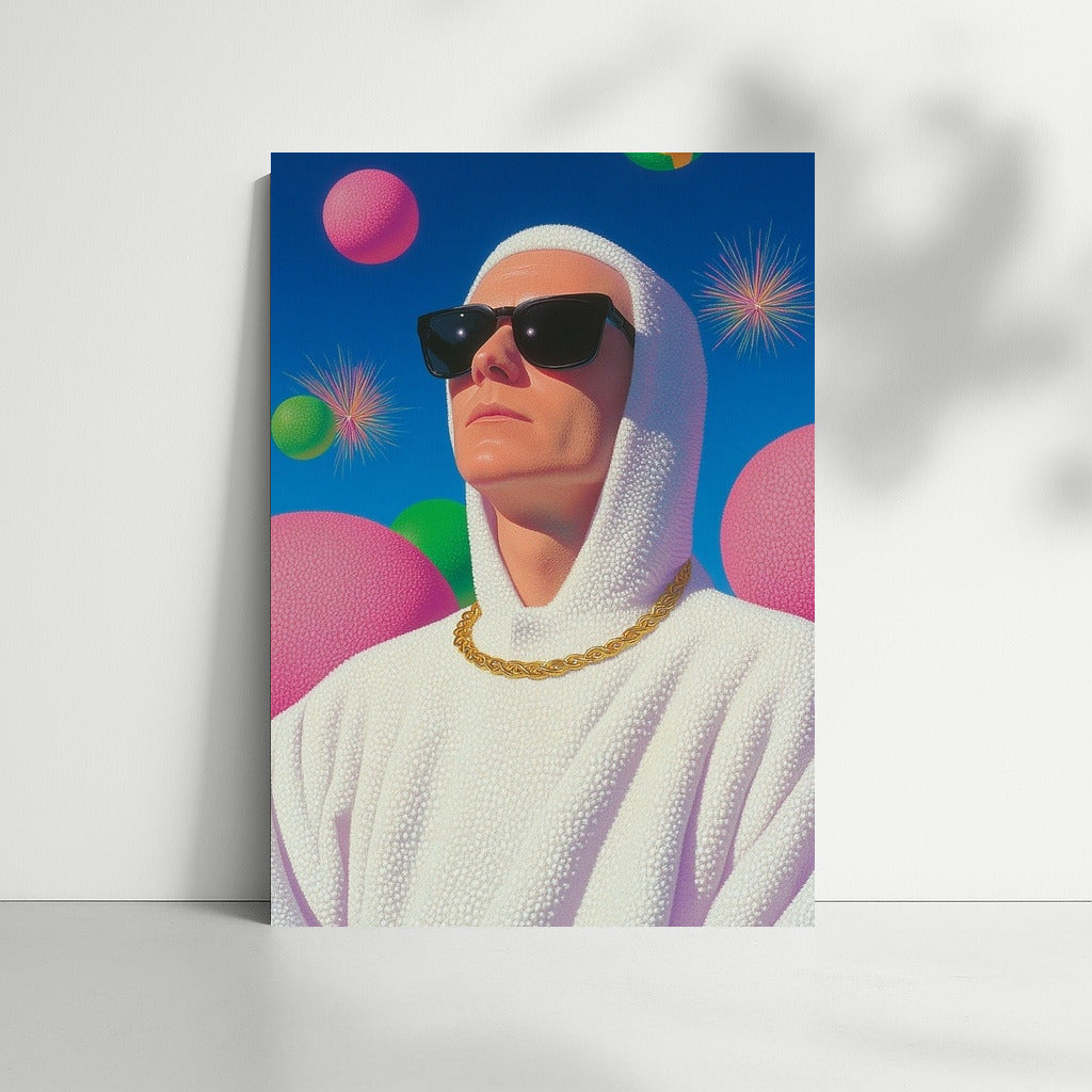 Retrofuturist poster: a mysterious figure in sunglasses against a backdrop of bright spheres. The art of transcendental dreams! See more from the collection: Mixed Wall Art