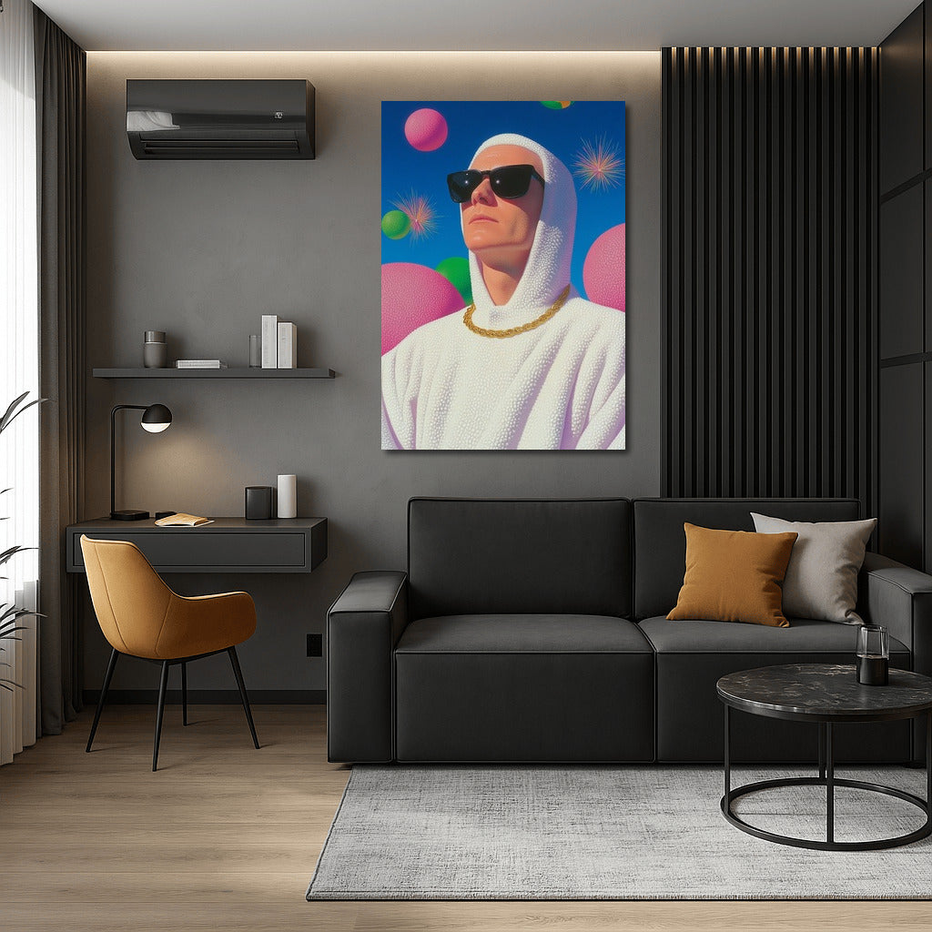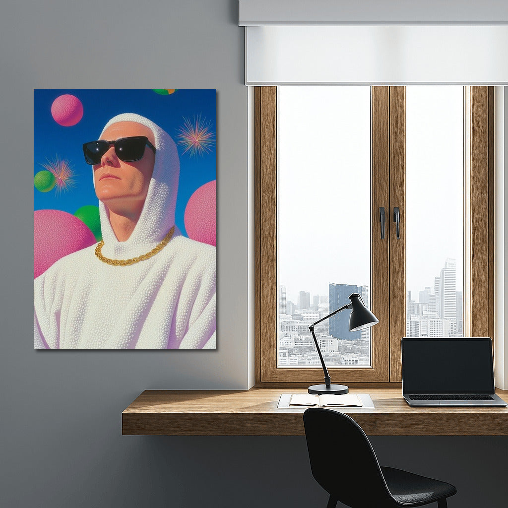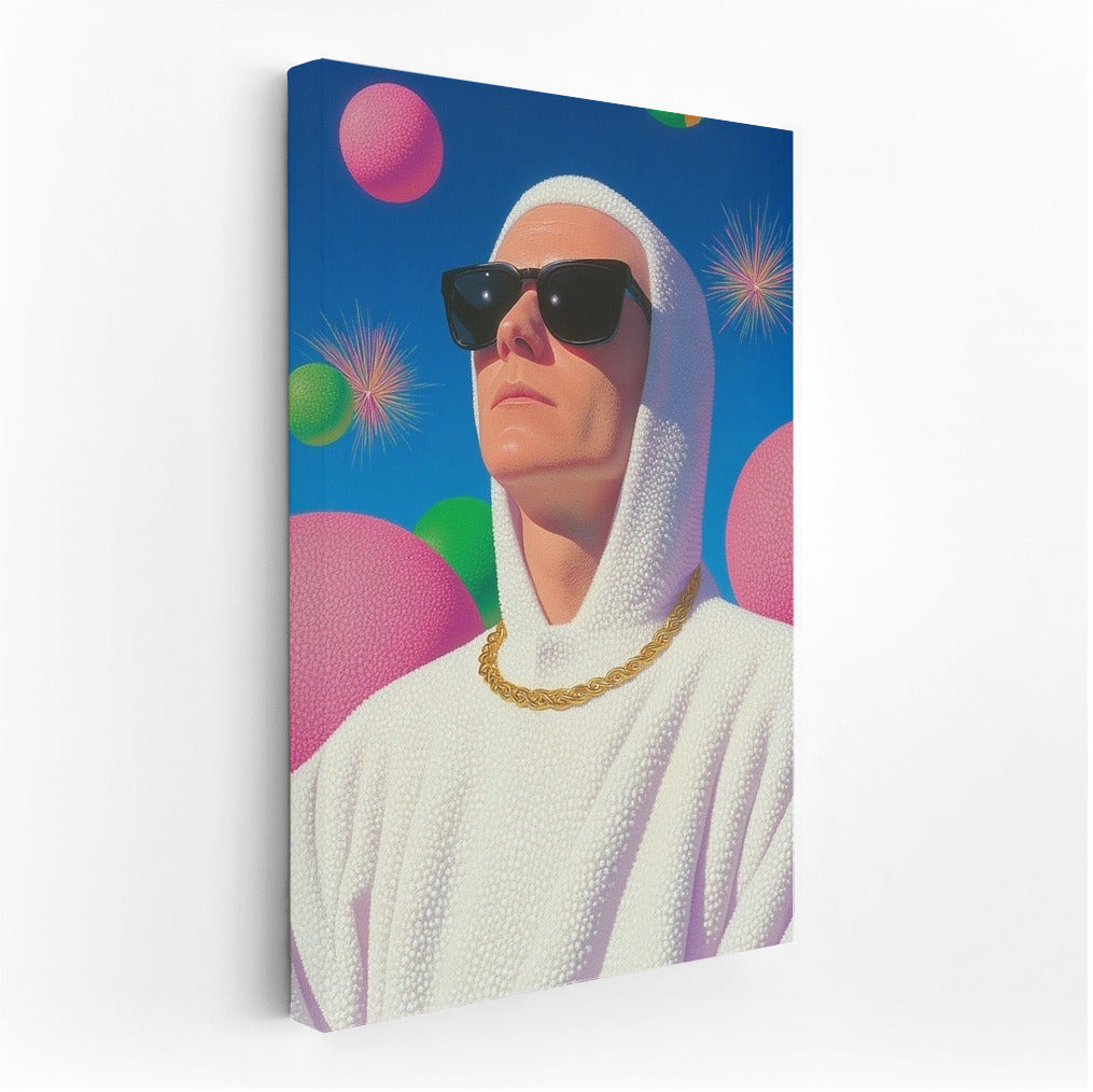 Retrofuturist poster: a mysterious figure in sunglasses against a backdrop of bright spheres. The art of transcendental dreams! See more from the collection: Mixed Wall Art