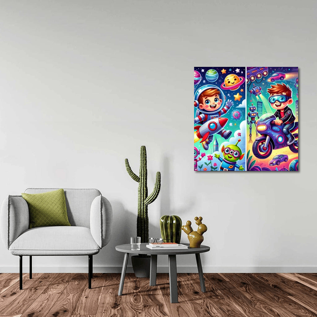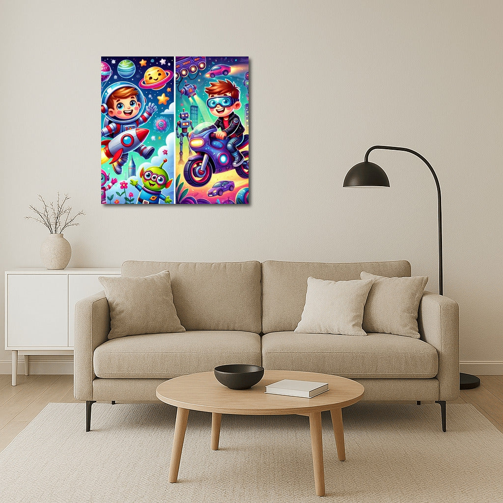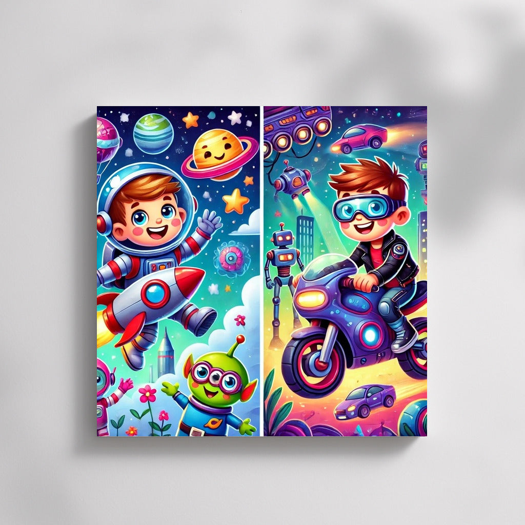 A magical world for young explorers: a poster with adventures in space and on a futuristic motorcycle, bright wall art. See more from the collection: Art For Boys