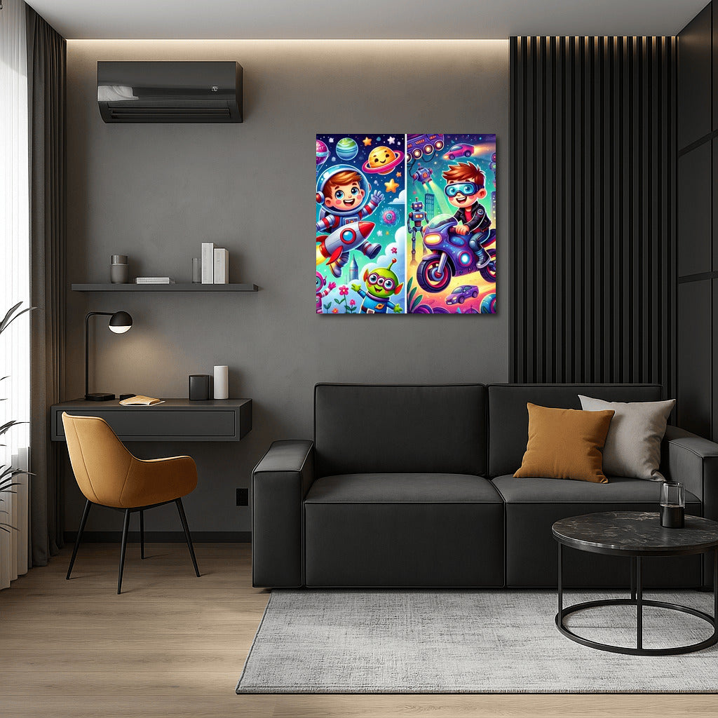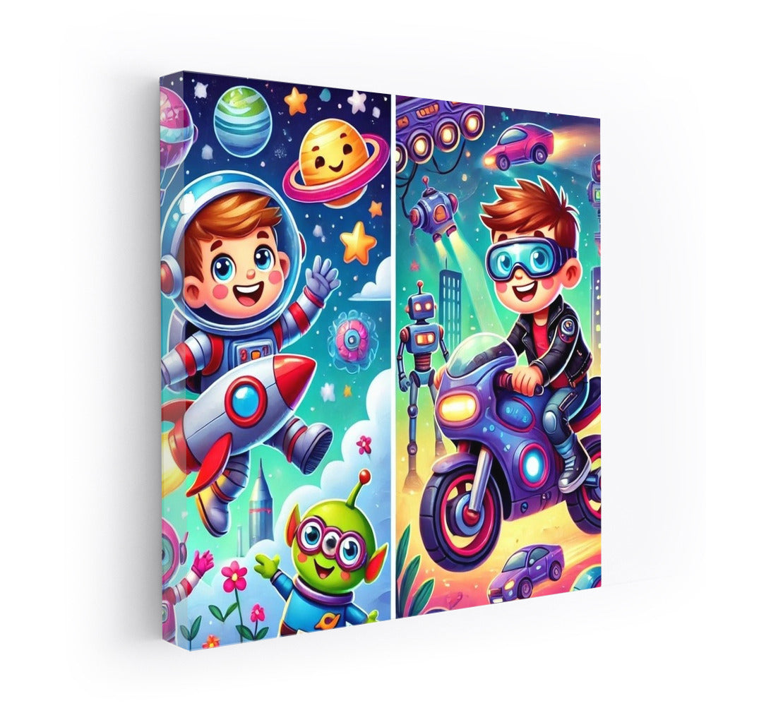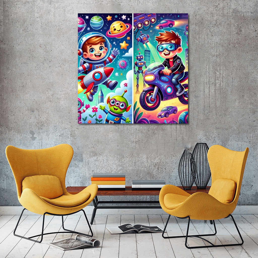 A magical world for young explorers: a poster with adventures in space and on a futuristic motorcycle, bright wall art. See more from the collection: Art For Boys