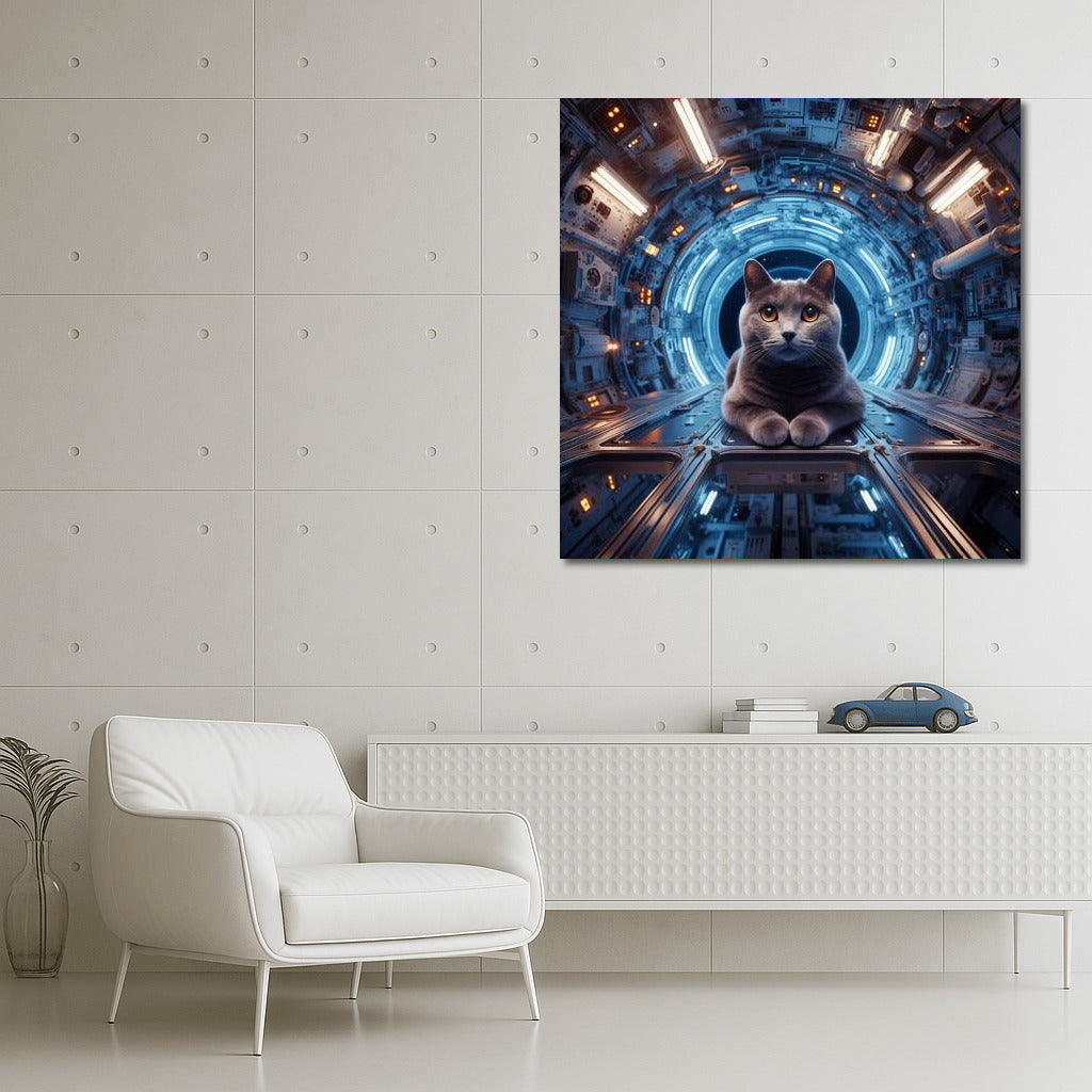 Space Odyssey in Russian Blue style: a mesmerizing poster with a cat on board the station. Wall art beyond gravity! See more from the collection: Animals Art