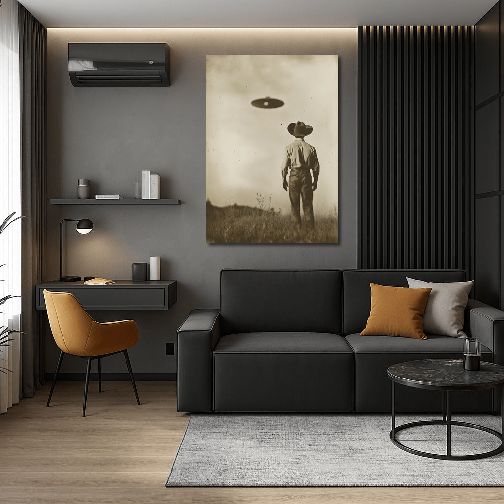 A man in a cowboy hat looks at a retro UFO. Mysterious wall art that will take you to a world of fantasy! See more from the collection: Mixed Wall Art