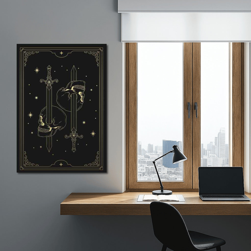 Mysterious poster: swords and skulls intersecting against a backdrop of stars. Wall art that inspires thought. See more from the collection: Zodiac Sign & Astrology Art