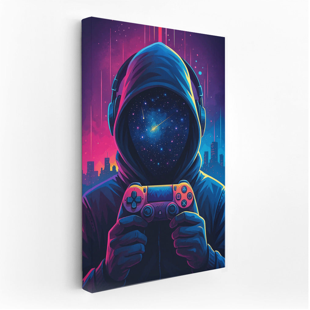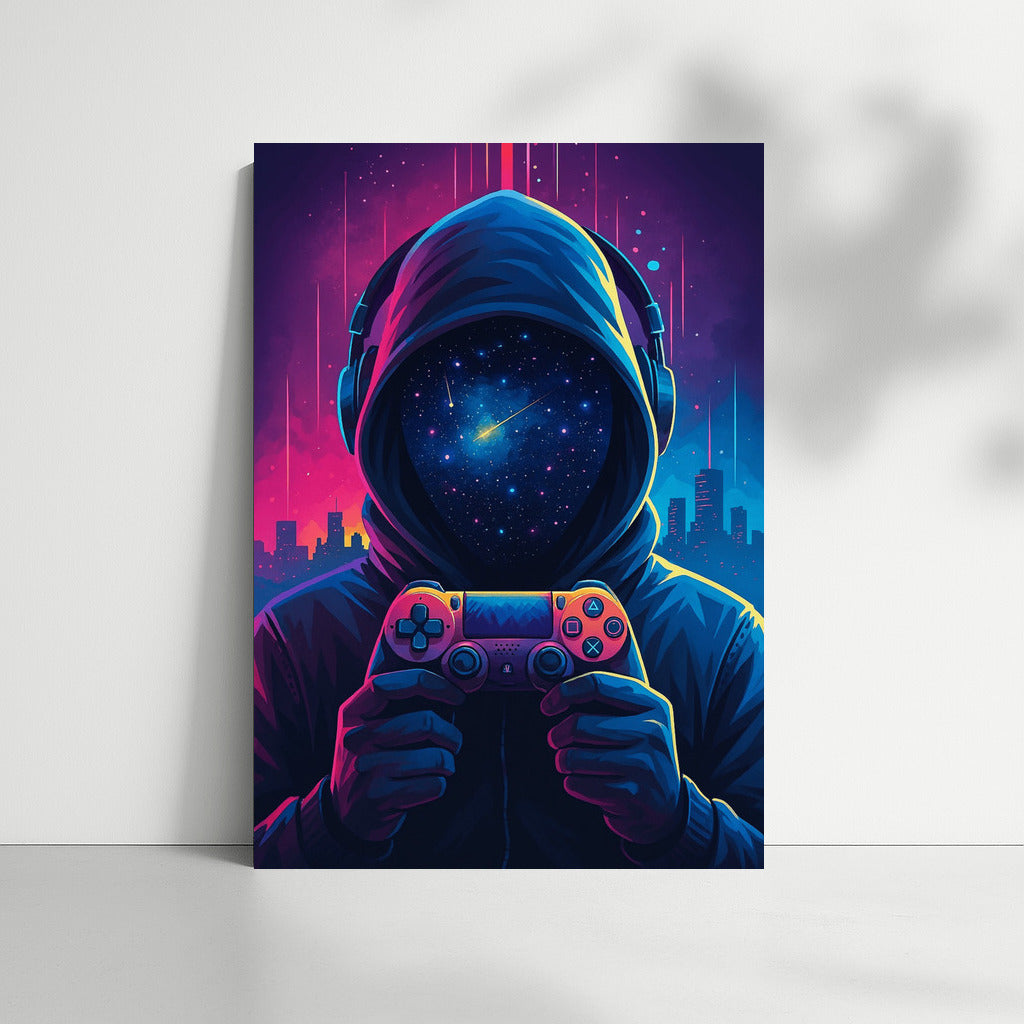 A poster featuring a mysterious hooded figure holding a gamepad immerses you in the cosmic world where your gaming journey begins. See more from the collection: Gaming Art