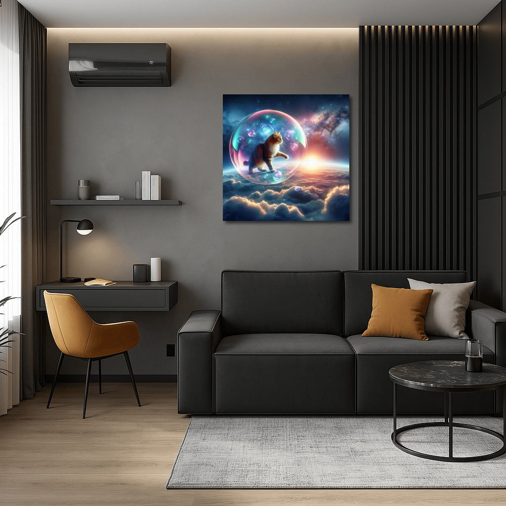 A cat exploring space inside a soap bubble is a magical painting that turns any wall into a portal of dreams and fantasy. See more from the collection: Animals Art