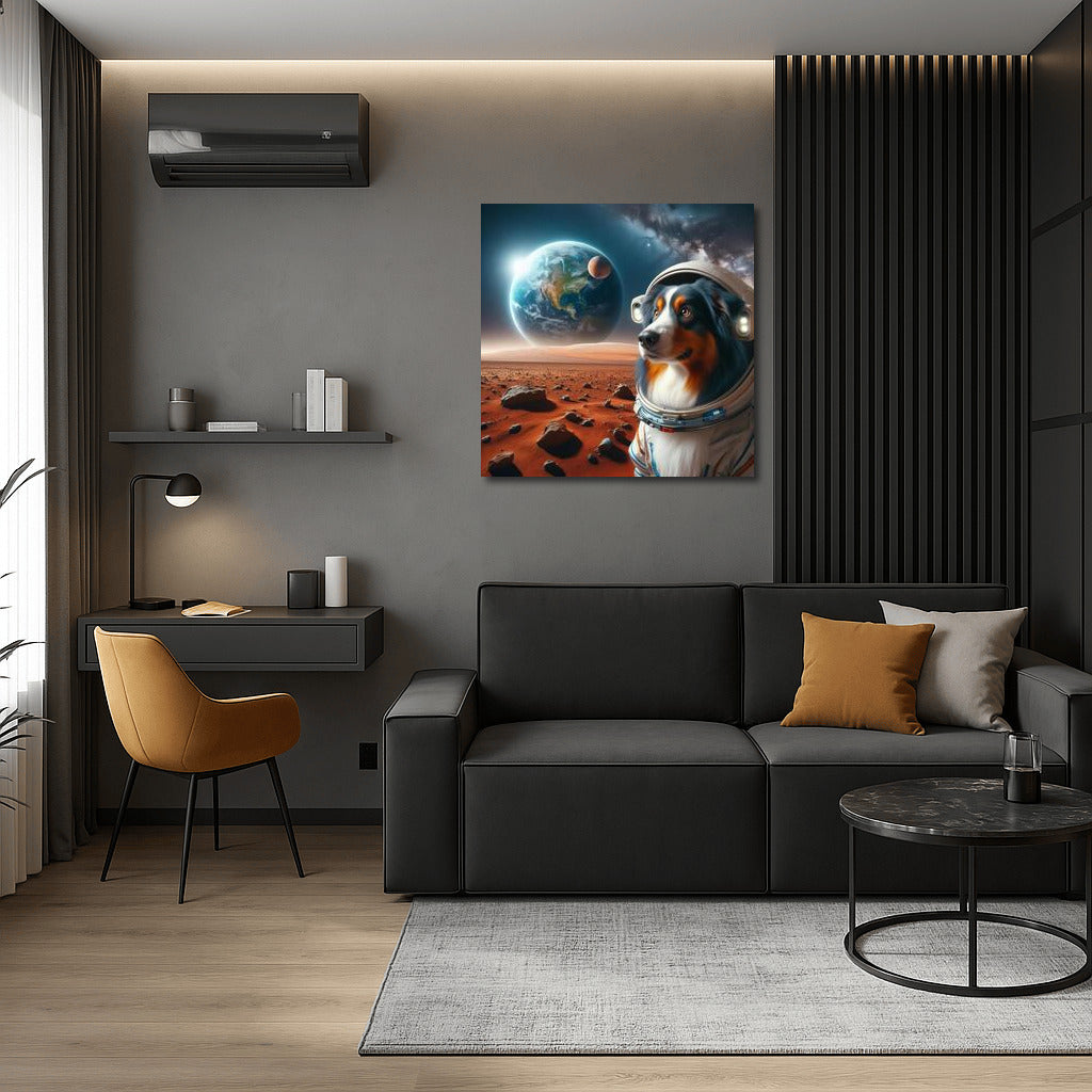 Space Travel: Australian Shepherd in Spacesuit on Mars Looks at Earth Wall Art