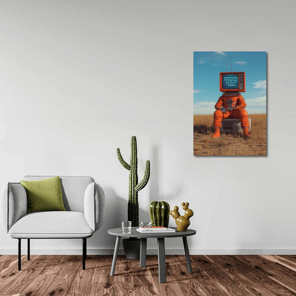 Space wall art: a mysterious astronaut with a TV instead of a head against the backdrop of endless fields. Dream poster! See more from the collection: Space & Astronomy Art