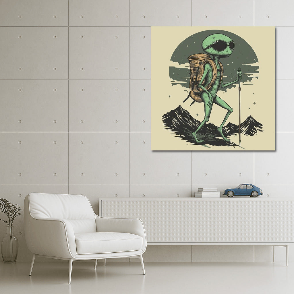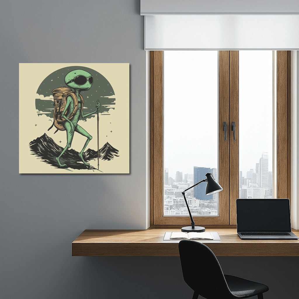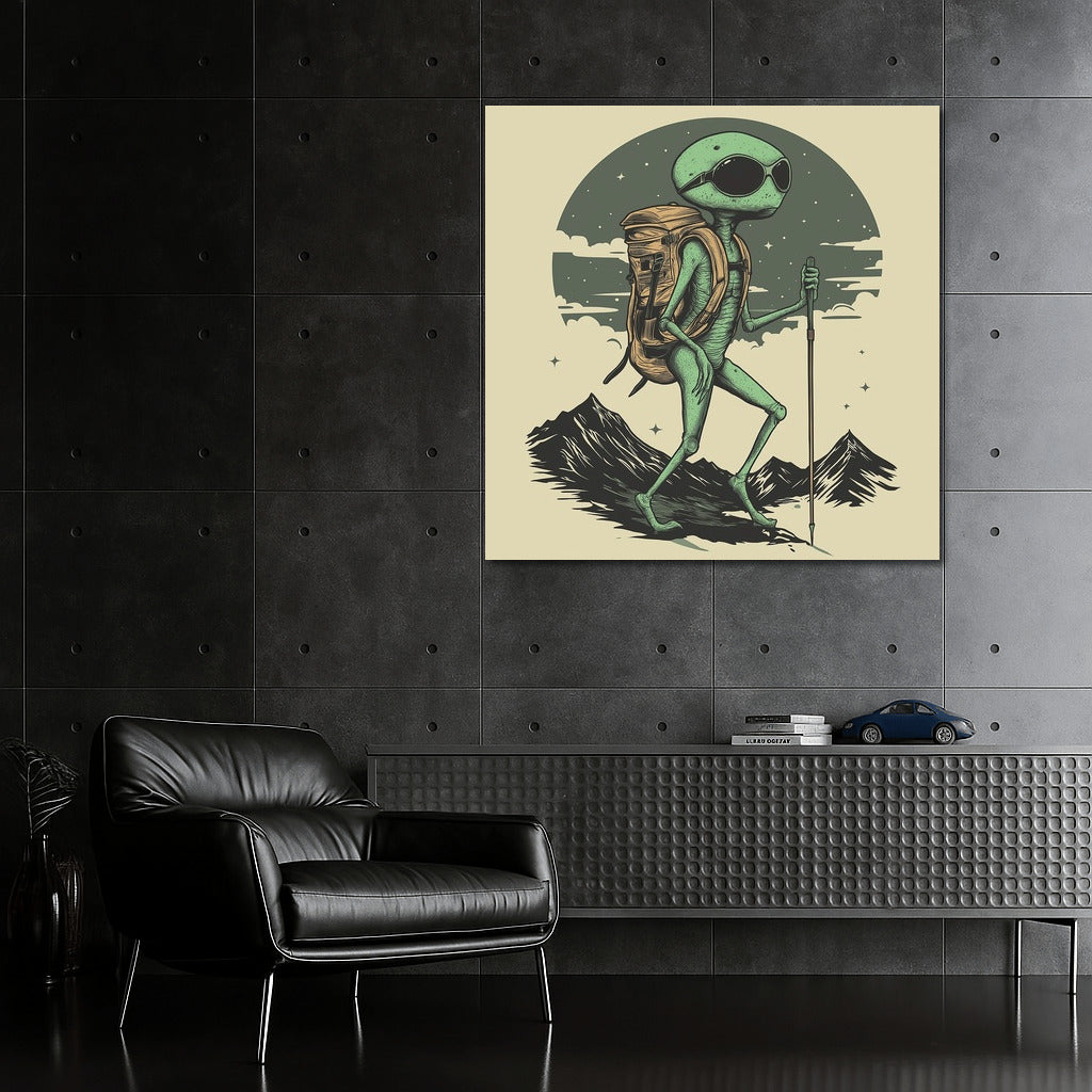 Mysterious Traveler: A Poster of an Alien in the Mountains. Wall art that inspires space travel. See more from the collection: Mixed Wall Art