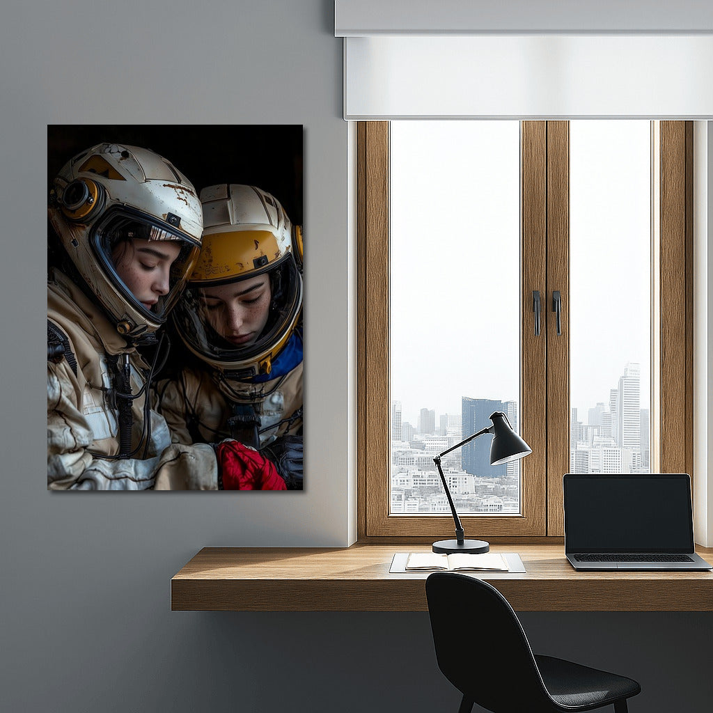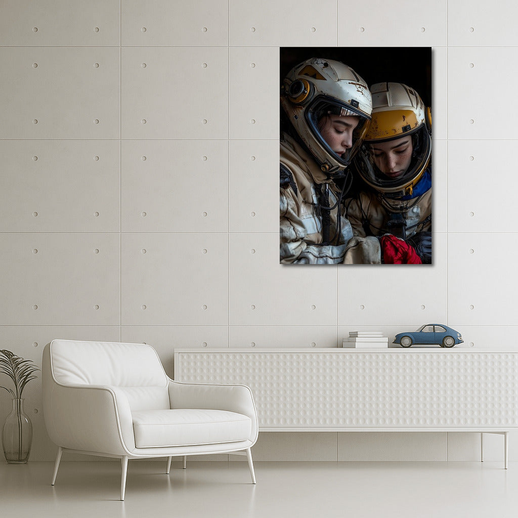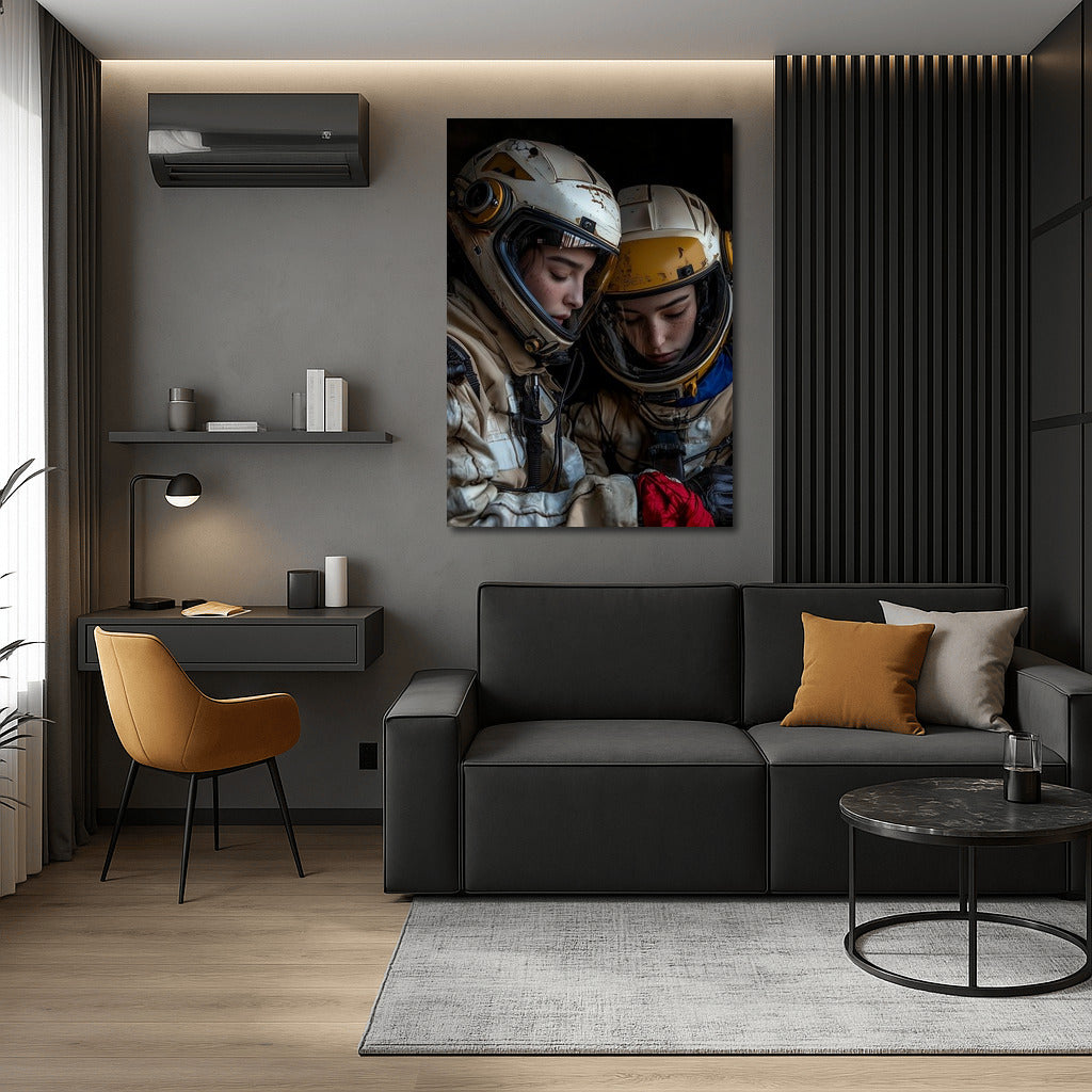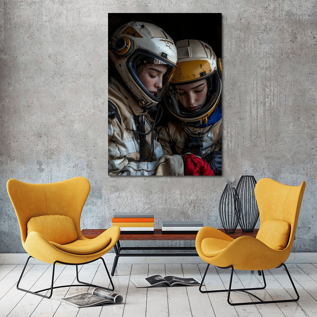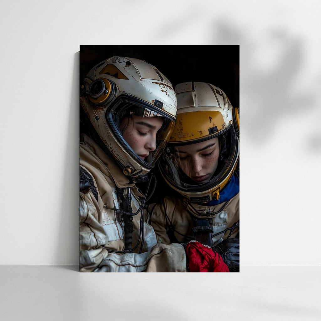 A mysterious poster of space travelers in helmets diving into the world of stars and dreams. Wall art for your home. See more from the collection: Space & Astronomy Art