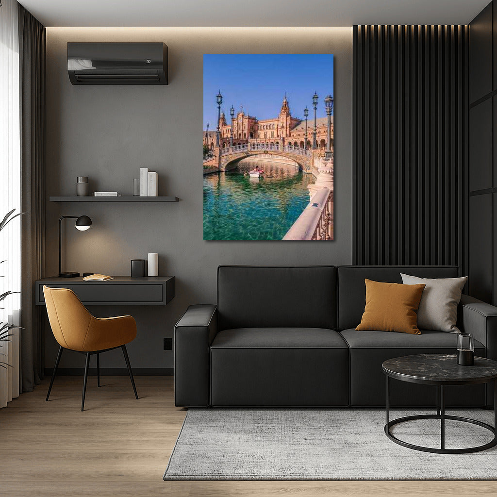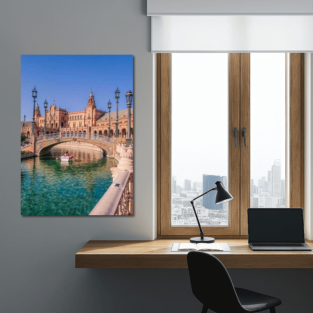 Spanish romance on your wall: a majestic bridge and a calm boat in the heart of the country. Perfect wall art! See more from the collection: Country Art