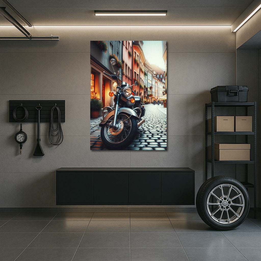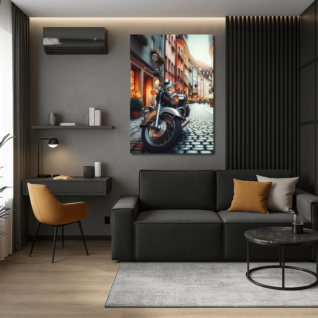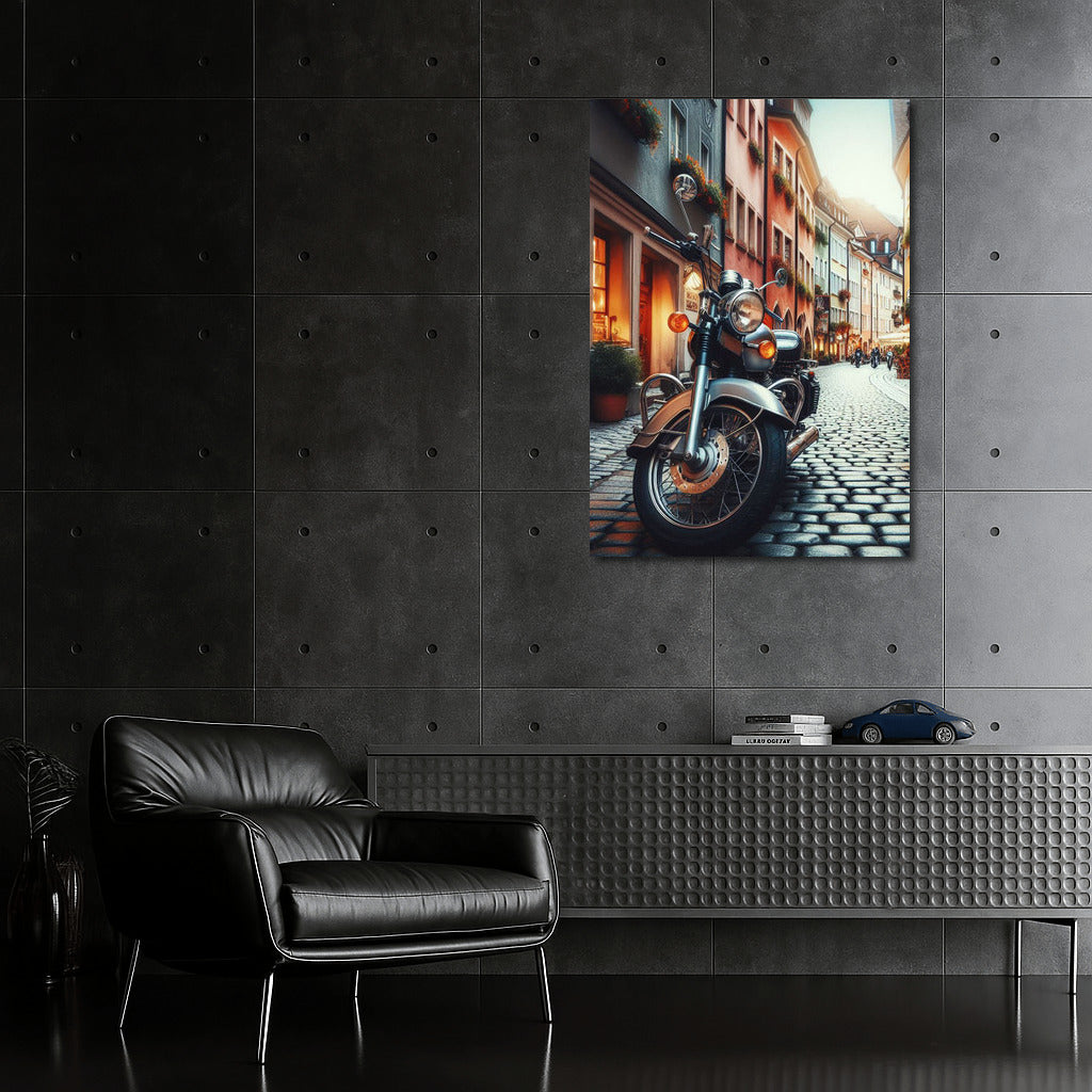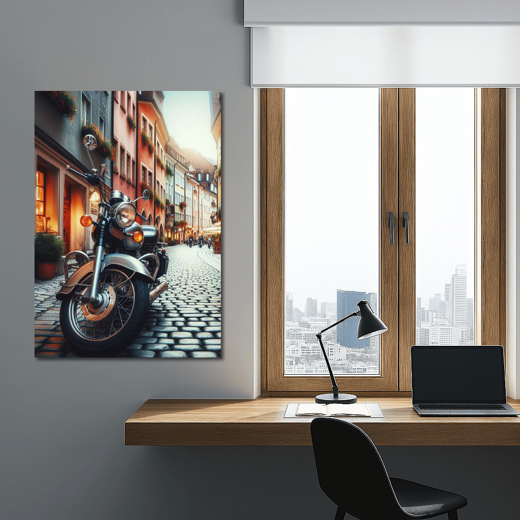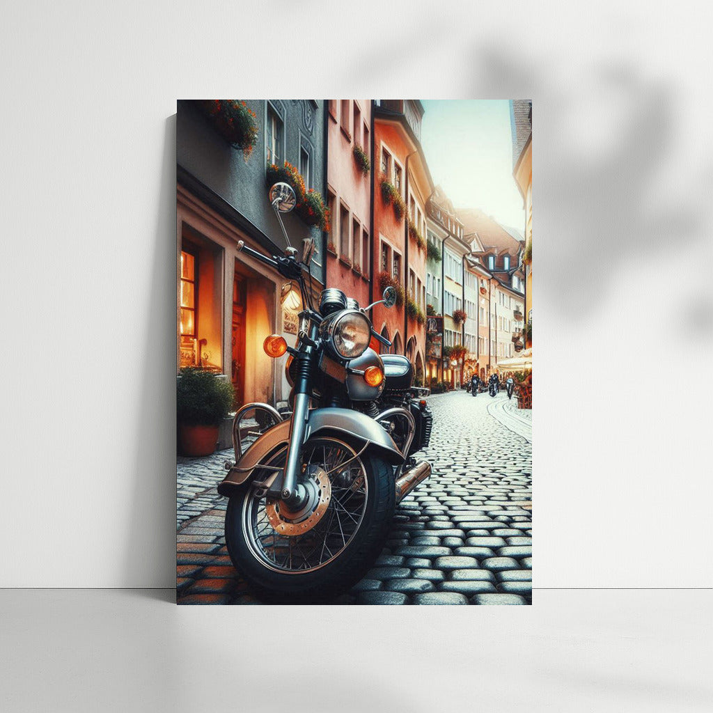 Legendary Indian motorcycle in the heart of historical Europe. This poster is the key to romance and speed! See more from the collection: Indian Motorcycle Art