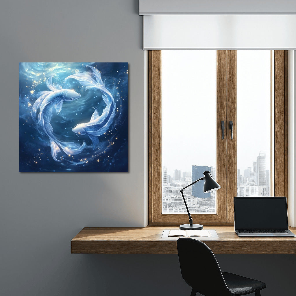 The magic of the underwater world: a poster of two shining fish in a serene dancing spiral. Wall art that brings harmony. See more from the collection: Mixed Wall Art