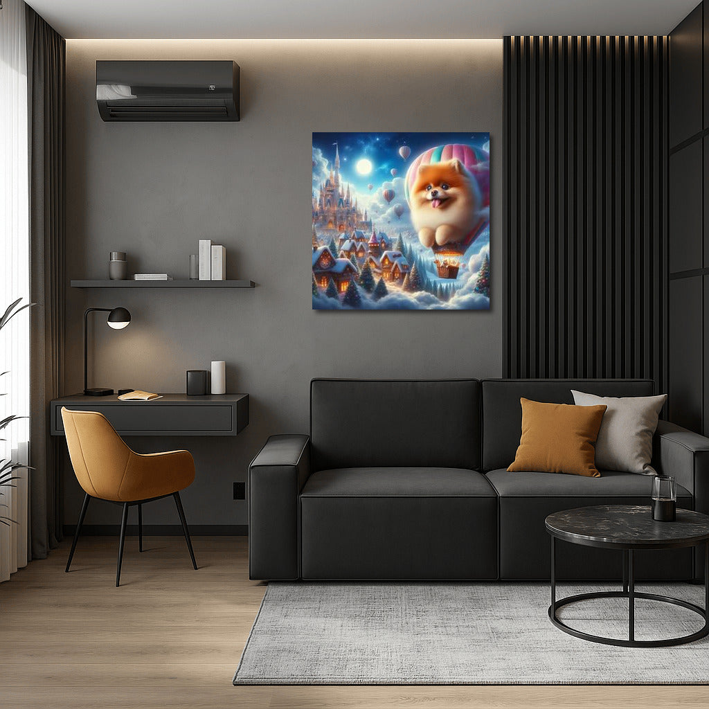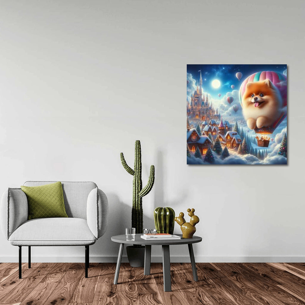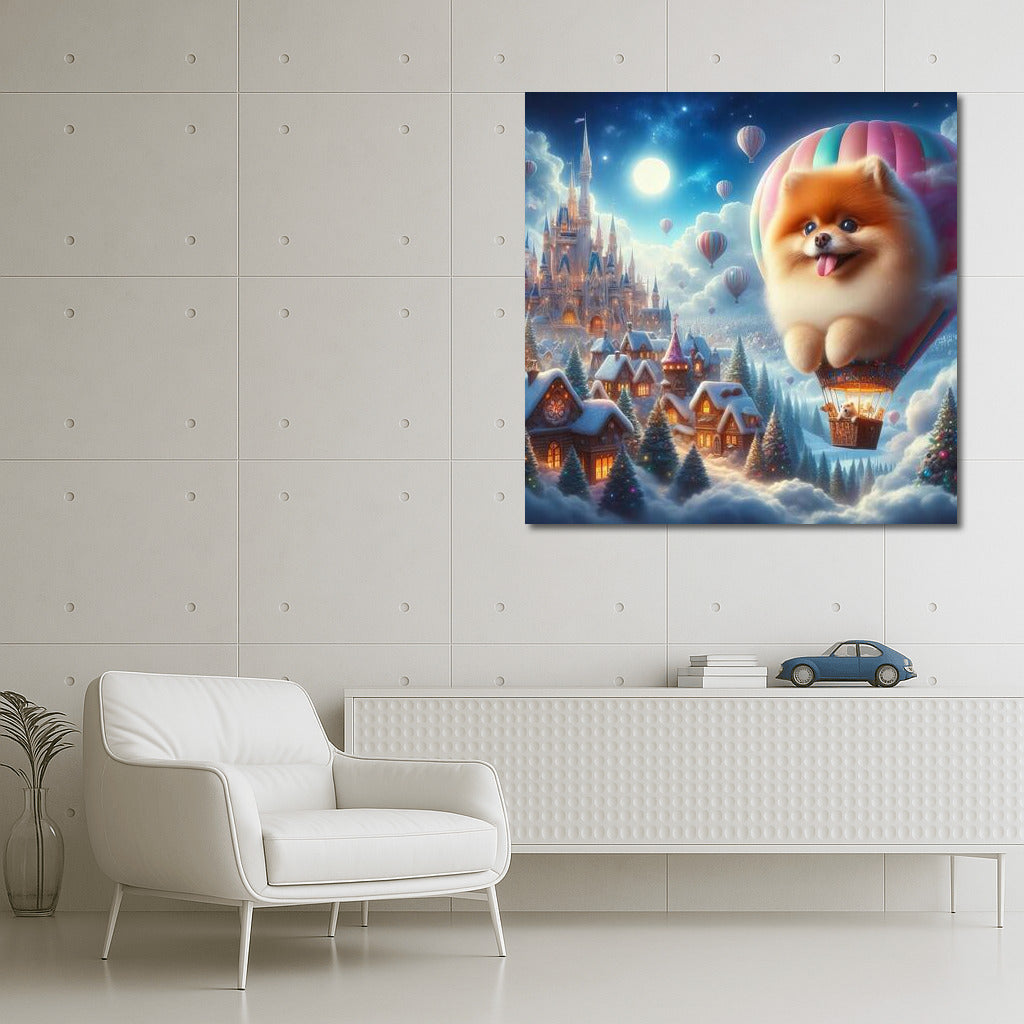 Fluffy Spitz in a hot air balloon soars above a fairy-tale city. Charming poster for a magical atmosphere in your home! See more from the collection: Animals Art