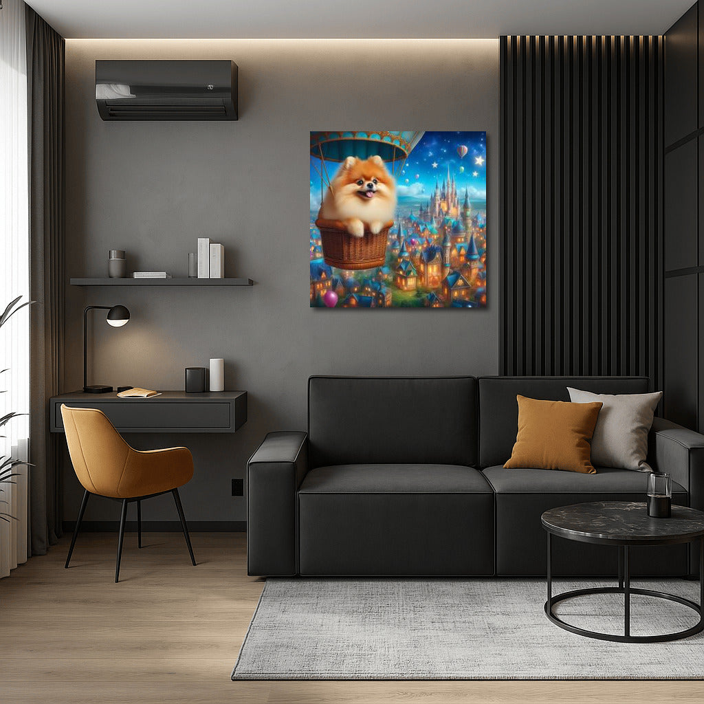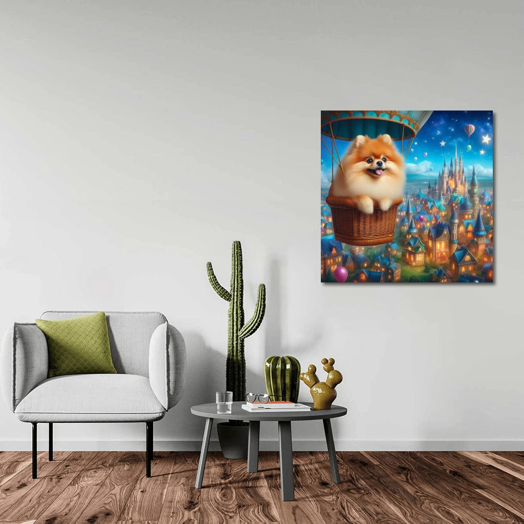 This painting shows a Spitz in a hot air balloon floating above a fairytale town. The perfect poster for dreamers and adventure lovers! See more from the collection: Animals Art