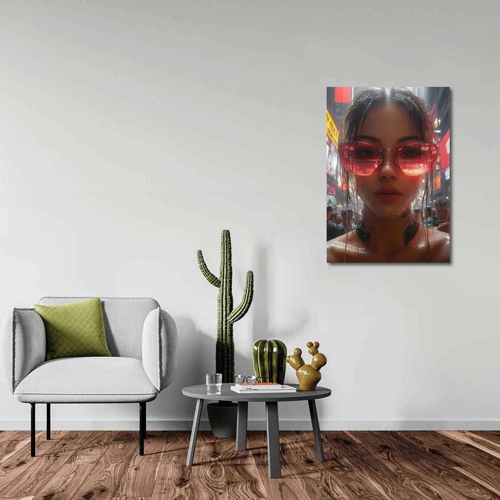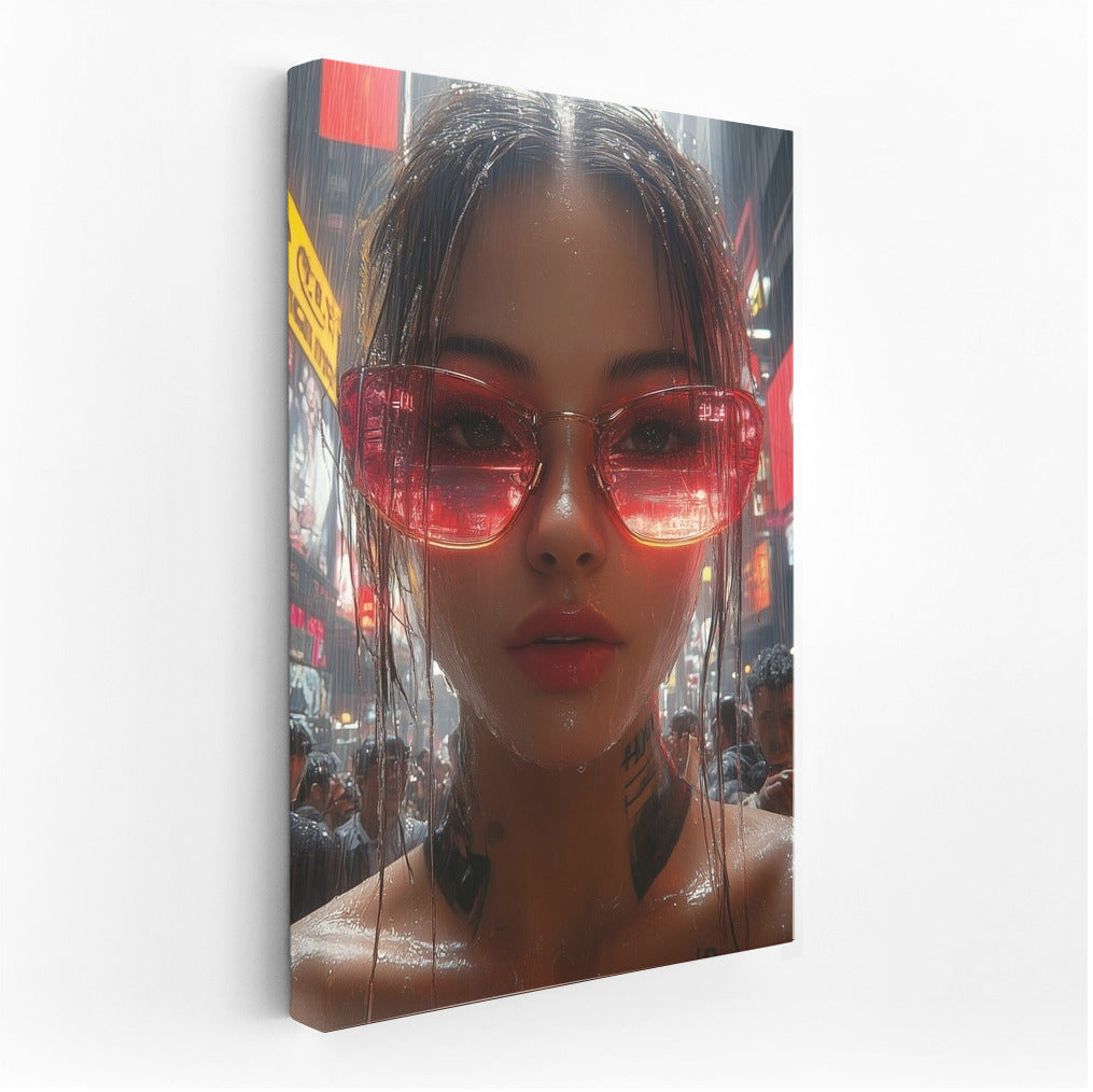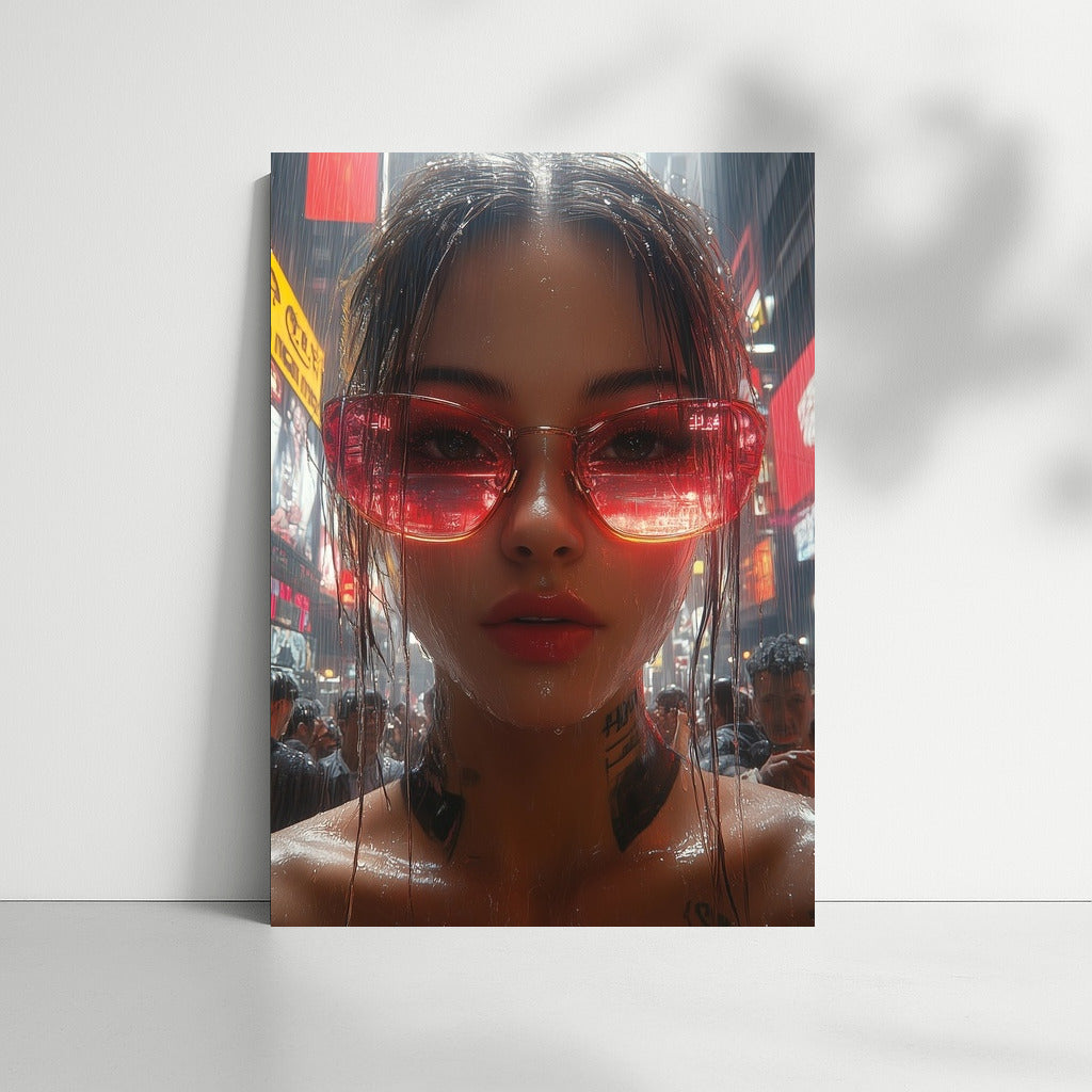 Urban energy and style: a poster of a figure in colorful glasses in the rain. Wall art that will liven up any space! See more from the collection: Urban Art
