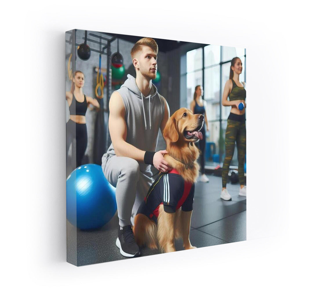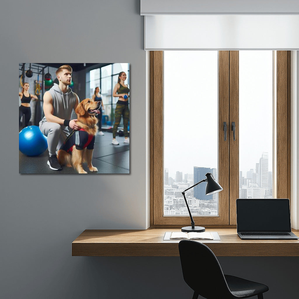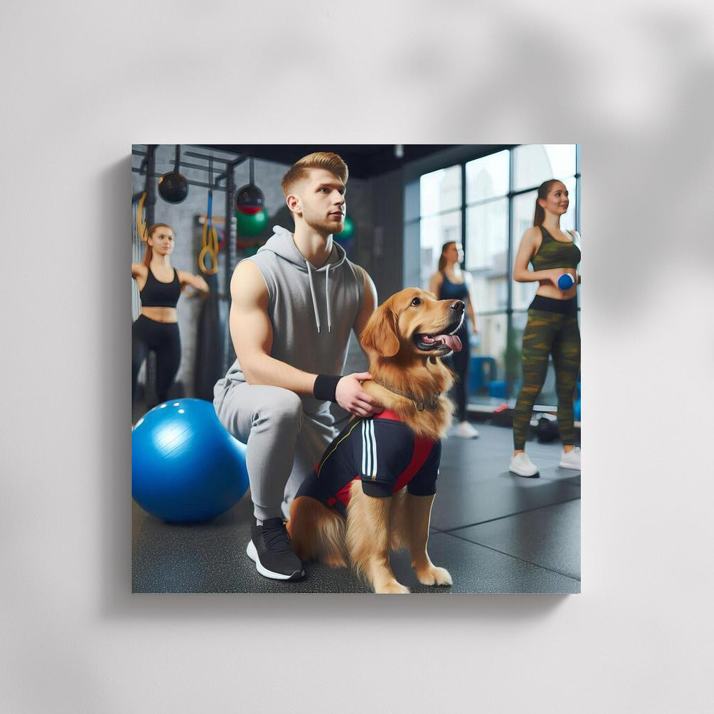 Sporty Harmony: A painting of a man and a dog in a gym, inspiring activity. Great wall art for the home. See more from the collection: Animals Art