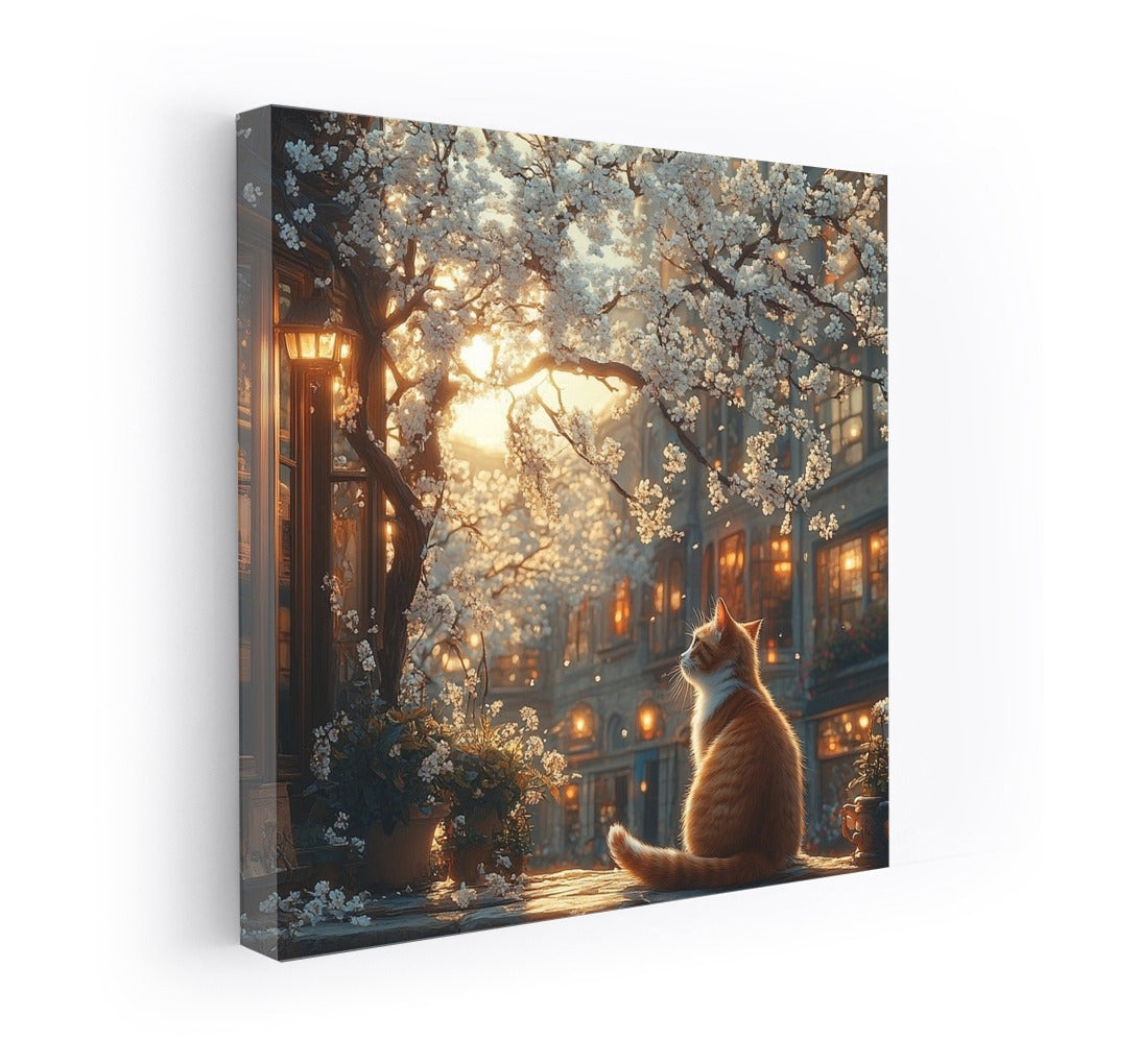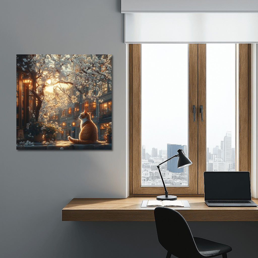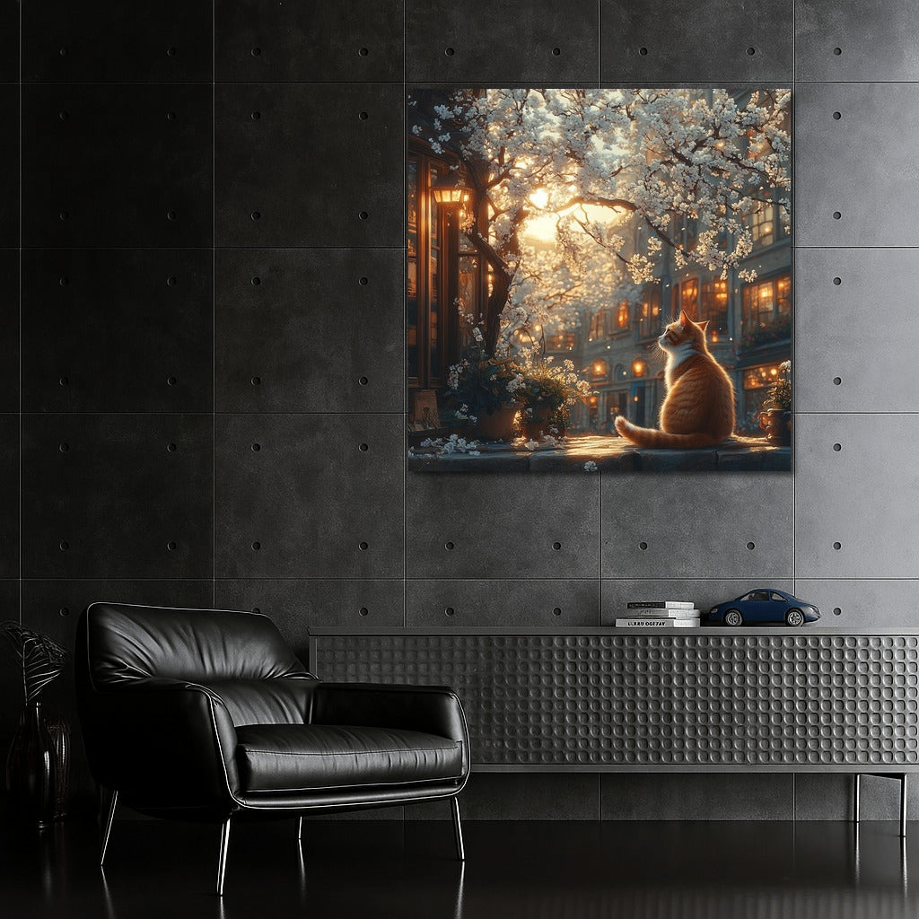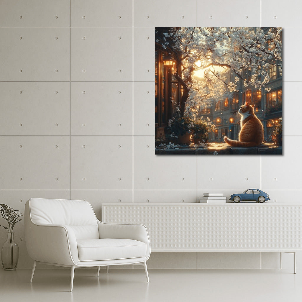 Cat enjoying spring in blooming city. Art for soul, poster for your space. Wall inspiration! See more from the collection: Animals Art