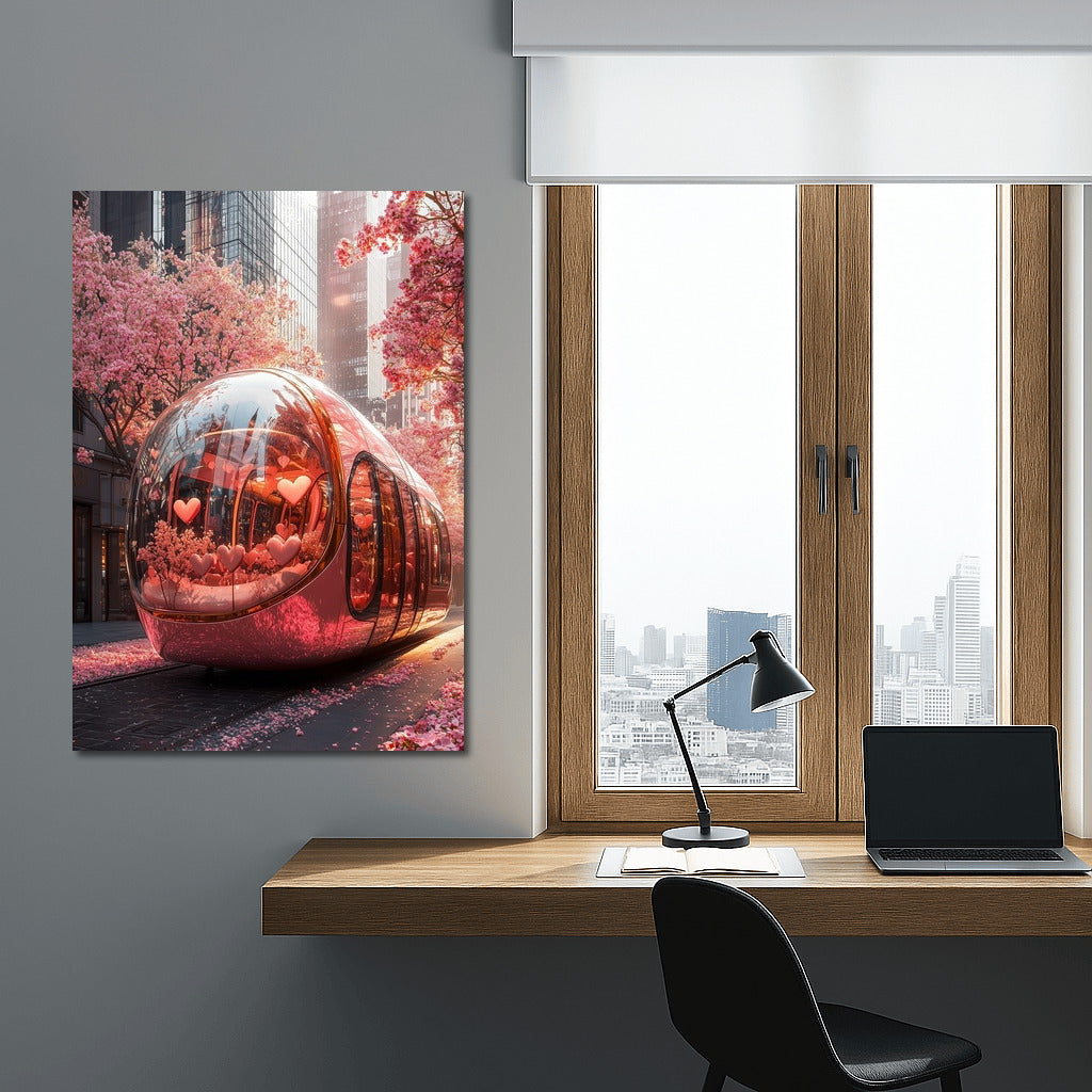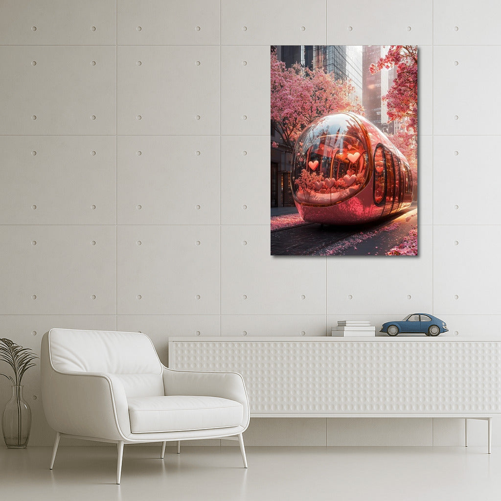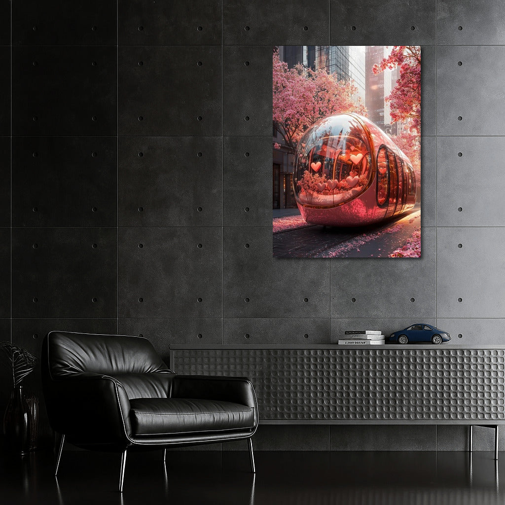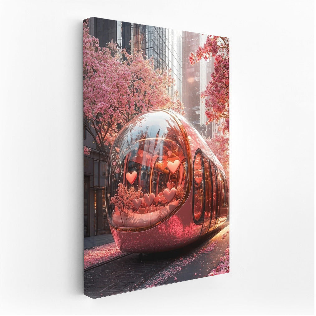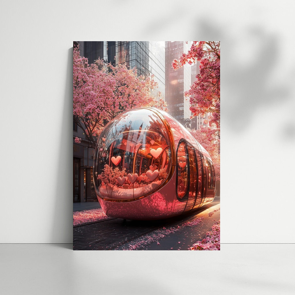 Futuristic poster: shining train among cherry blossoms in spring metropolis. Add romance to your wall art! See more from the collection: Mixed Wall Art