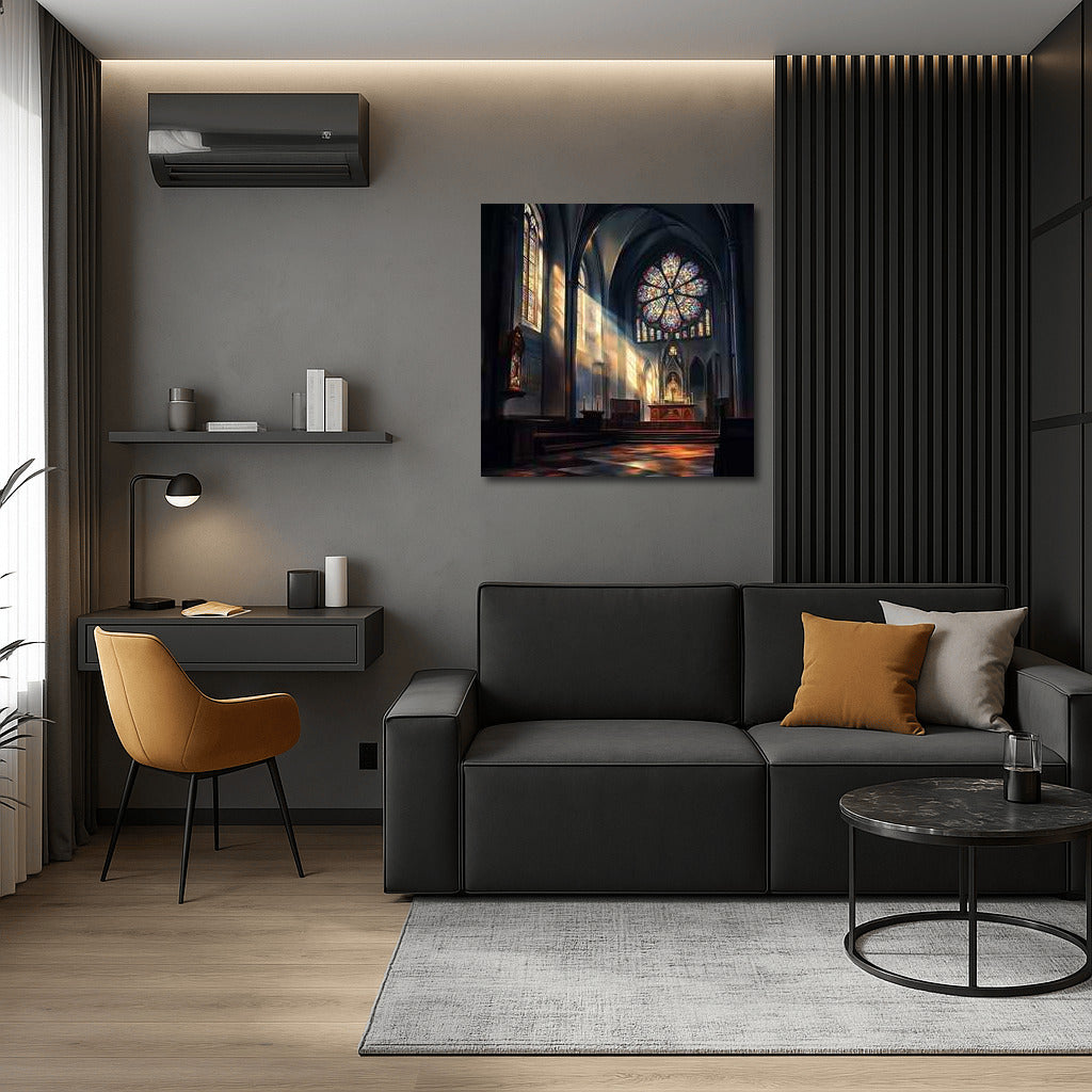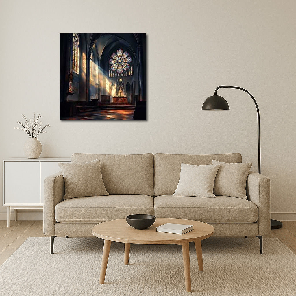 A gothic dream on canvas: the light of stained glass windows brings the church vaults to life. Ideal wall art for connoisseurs of the spiritual. See more from the collection: Religion Art