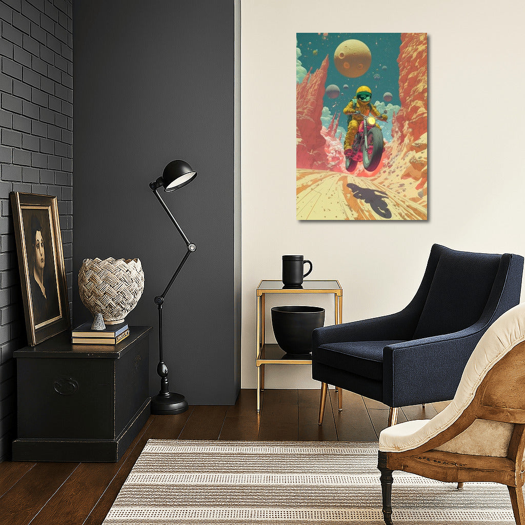 Space Odyssey on a Motorcycle: a poster where the universe comes alive and invites you to unprecedented journeys among the stars. Wall art! See more from the collection: Space & Astronomy Art