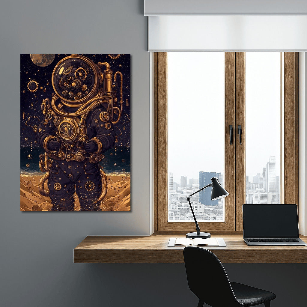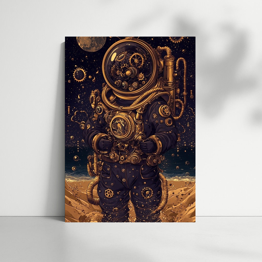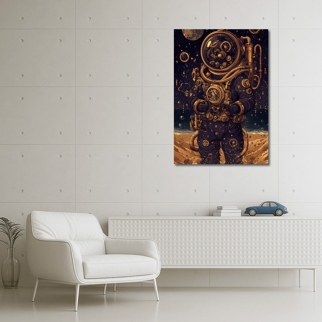 Steampunk space travel: a poster with a mysterious astronaut against the background of the starry sky and the moon. Wall art of the future! See more from the collection: Mixed Wall Art